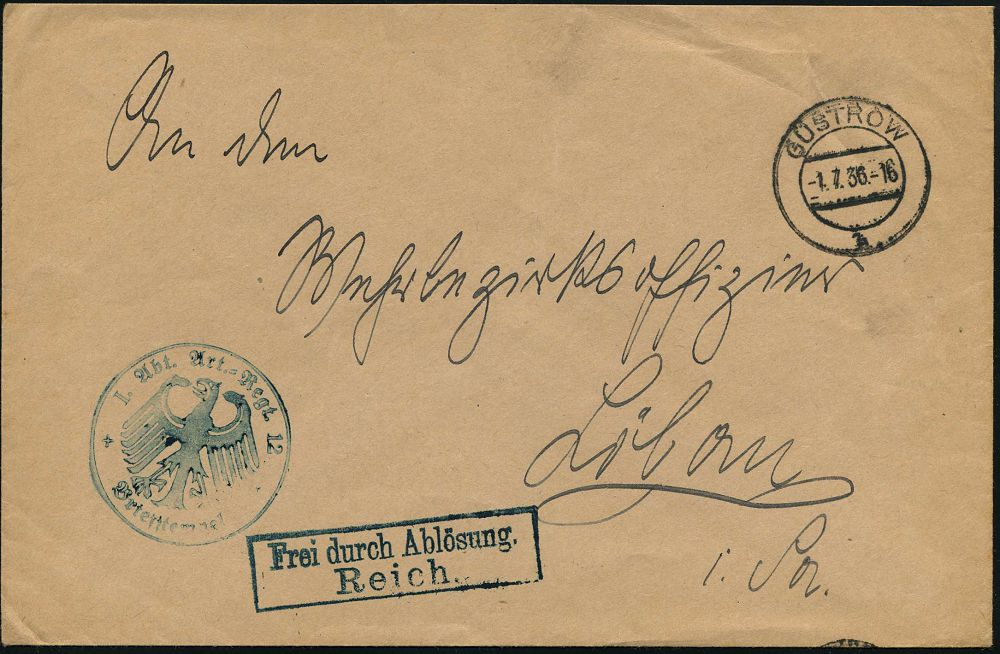 1897 | 15 € | DEUTSCHE WEHRMACHT 1933 - 31.8.1939 : GÜSTROW/ b 1936 (1.7.) 2K-Steg + blauer Ra.: fdA/Reich + blauer 1K-HdN: I. Abt. Art.=Regt. 12 (noch Weimarer Adler!) klar gest. Wehrmachts-Dienstbf. n. Löben | ![]() | |