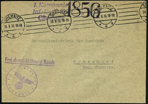 1884 | 15 € | DEUTSCHE WEHRMACHT 1933 - 31.8.1939 : CHEMNITZ/ *4a 1936 (28.8.) Band-Ma.St + viol. 1L: FdAR + viol. 1K-HdN: Jnf. Regt. 102/1. Kompanie (NS-Adler) + viol. Abs.-3L, Wehrmachts-Dienst-Bf. an Polizei, Röhrsdorf | ![]() | |