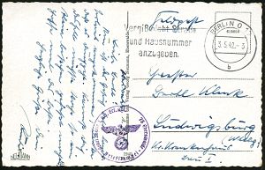1890 | 16 € | DEUTSCHE WEHRMACHT 1933 - 31.8.1939 : Eberswalde 1942 (3.5.) s/w.-Foto-Ak.: Eberswalde Kaserne des Artllerie-Regmts. 75/II (Portal mit Hakenkreuz-Adler u. Reichskriegsflagge!) viol. 1K-HdN: Genes. Battr. I. Art. Ers. Abt. 75 Eberswalde (Auflieferung Berlin), Feldpost-Kt. n. Ludwigsburg | ![]() ![]() | |