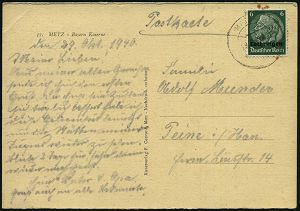 1930 | 12 € | DEUTSCHE WEHRMACHT 1933 - 31.8.1939 : ELSASS 1940 (29.10.) s/w.-Foto-Ak.: Bayern-Kaserne in Metz (sign.: Lubos), EF 6 Pf. Lothringen (Rostfleckchen) Bedarf n. Peine (Mi.4 EF, + 10.- EUR) | ![]() ![]() | |