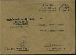 1881 | 18 € | DEUTSCHE WEHRMACHT 1933 - 31.8.1939 : BERLIN W 35 1935 (20.12.) Dienst-Bf.: Reichswehrministerium..Tirpitzufer 72-76/FdAR + schw. HdN noch mit Weimarer Adler! (etw. schwach) Abs. überstempelt , neuer Abs.-2L: ..Friedr.-Wilhelm-Str., Fern-Bf., Übergangszeit, aus "Reichswehr" wird "Wehrmacht" ab 16.3.1935 (Bo.S 165 A) | ![]() | |