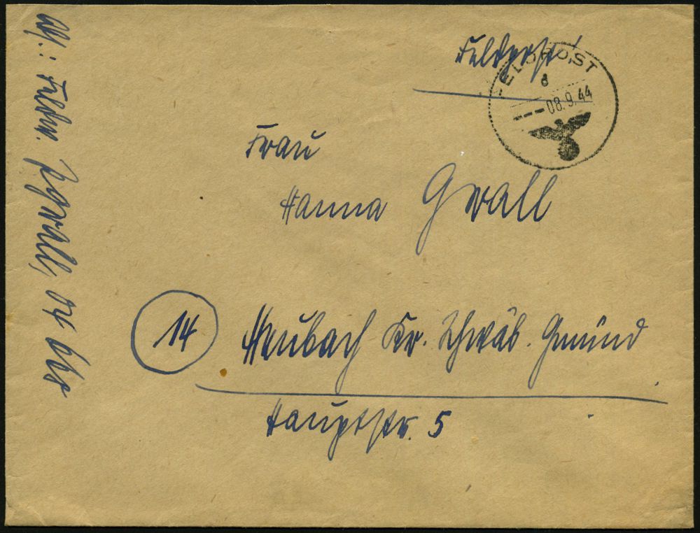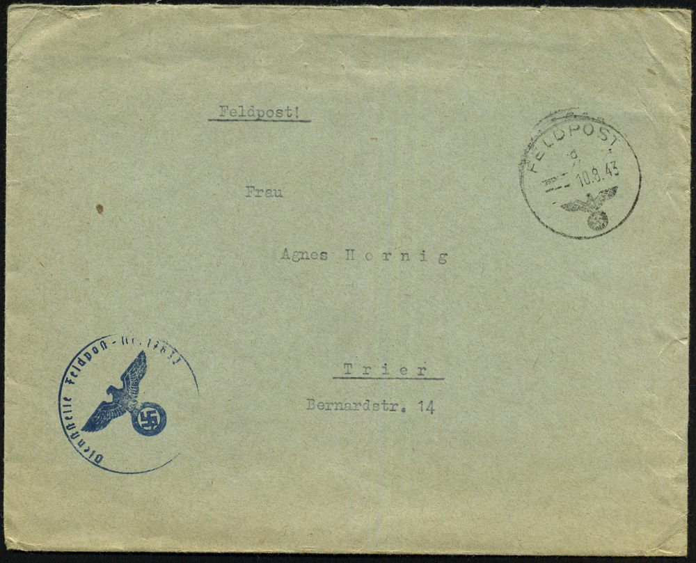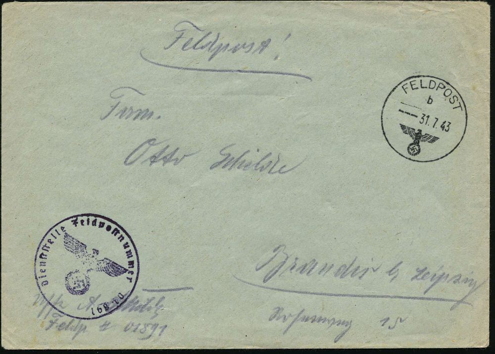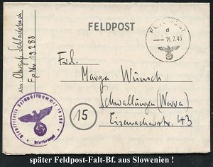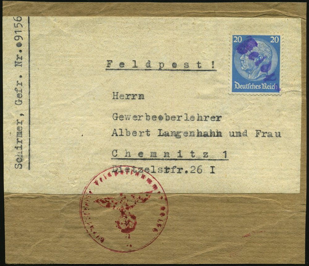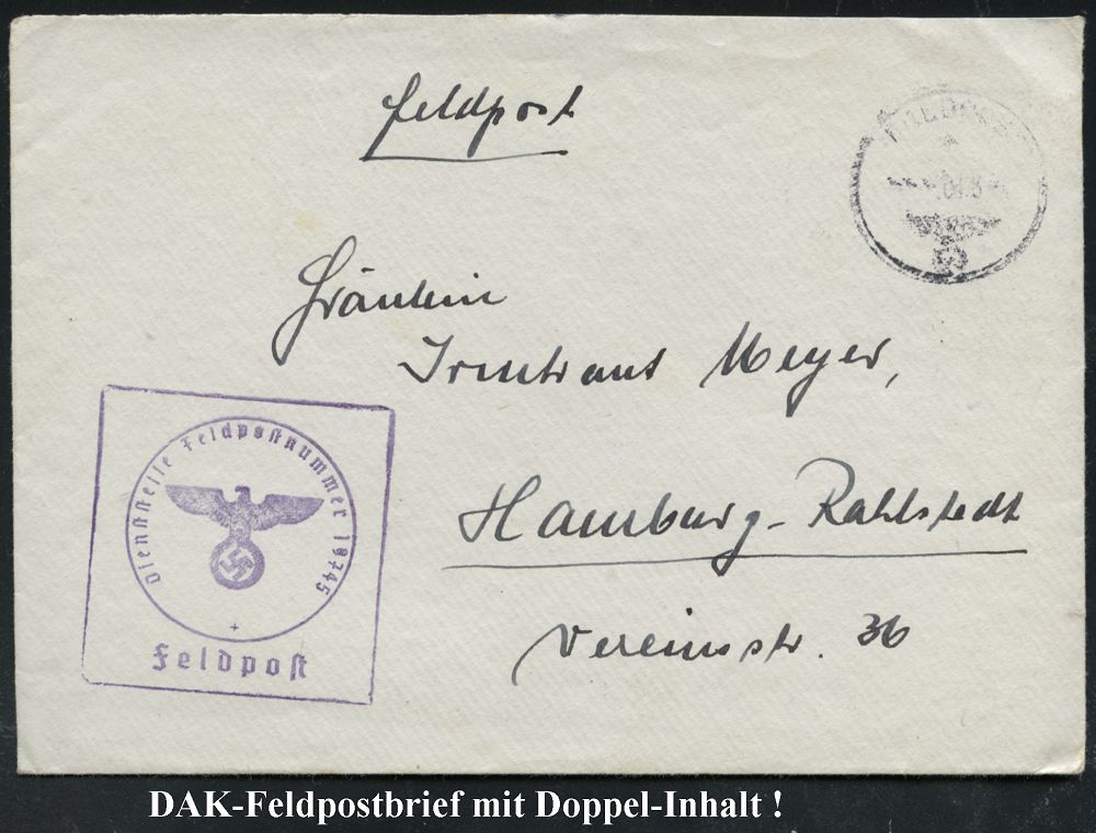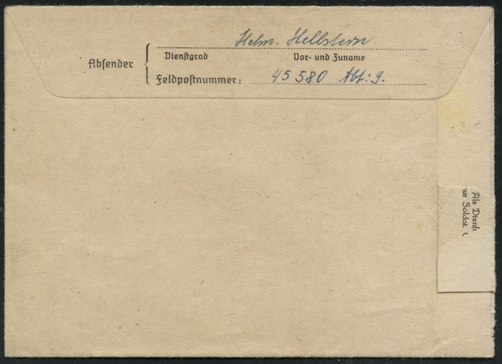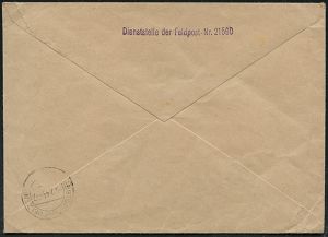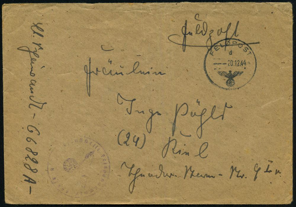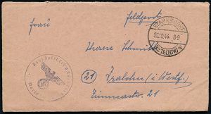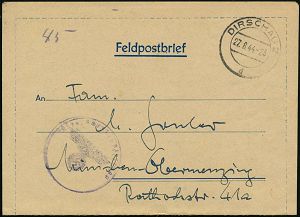 2149 | 14 € | II. WELTKRIEG (1939 - 1945) : DIRSCHAU 2/ d 1944 (27.8.) 2K-Steg + viol. 1K-HdN: Gren. Rgt. 89 Dirschau (etw. undeul.) + rs. hs. Fp.-Nr. 11 478 = Gren. Rgt. 89, Feldpost-Faltbf. m. Inhalt n. München | ![]() ![]() | |
