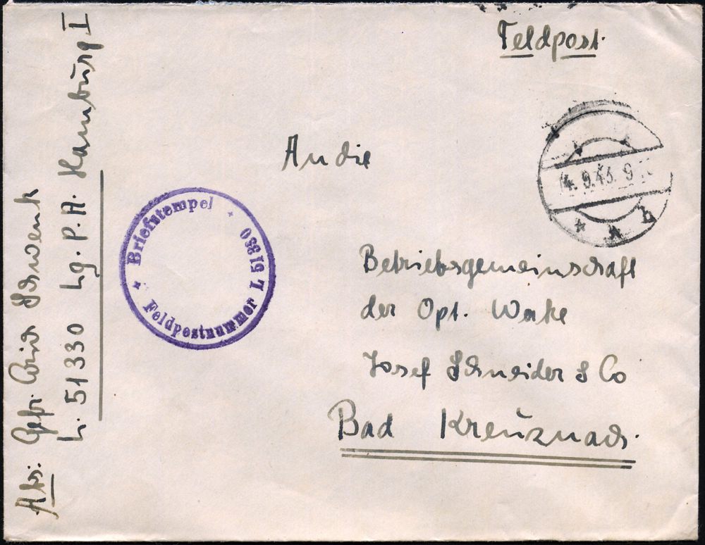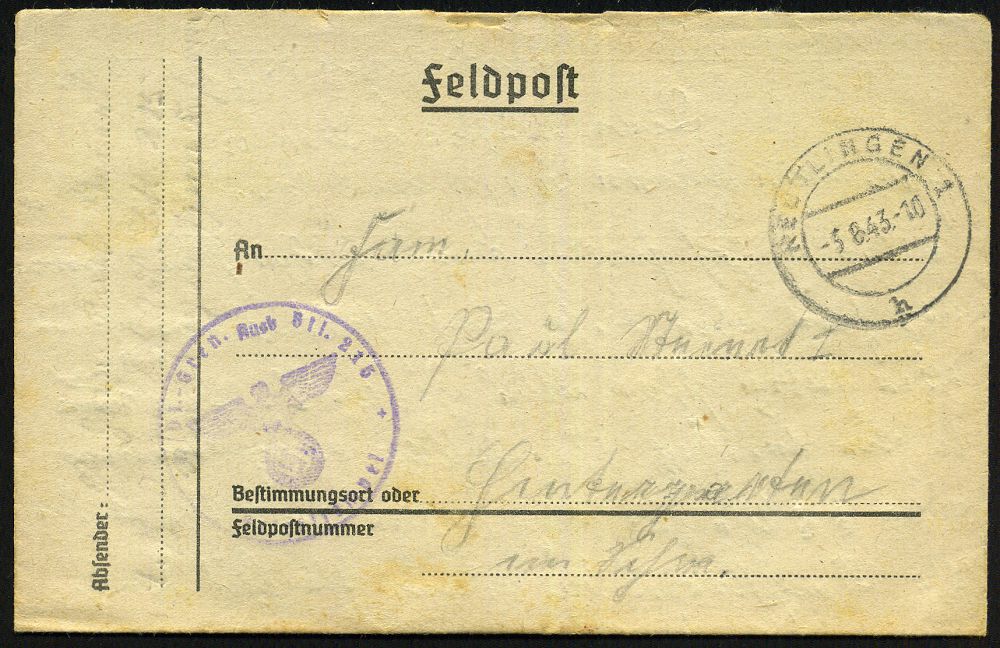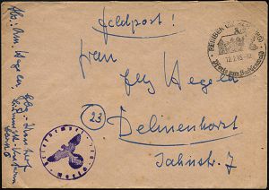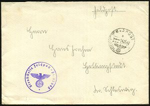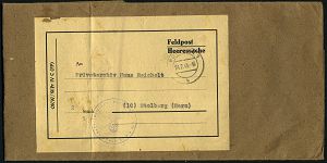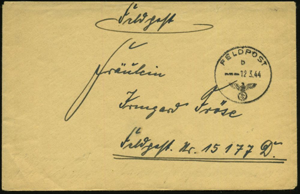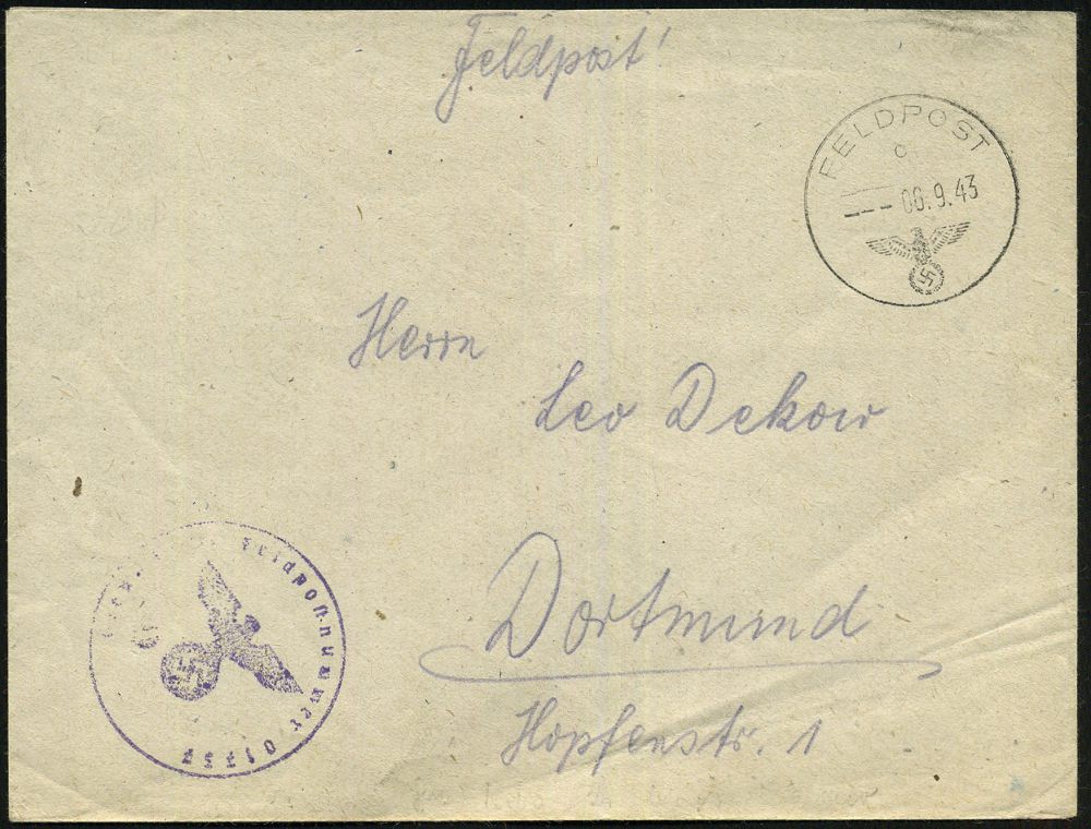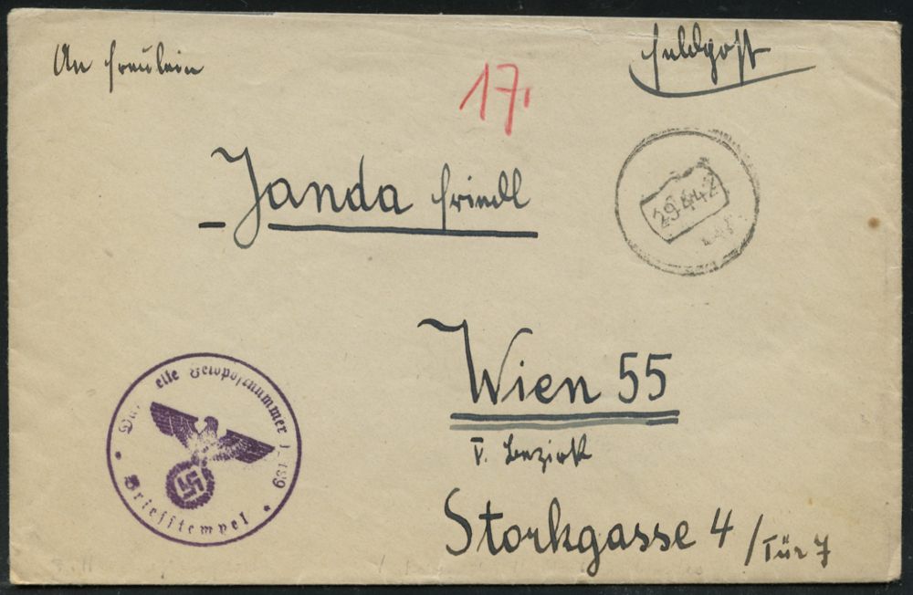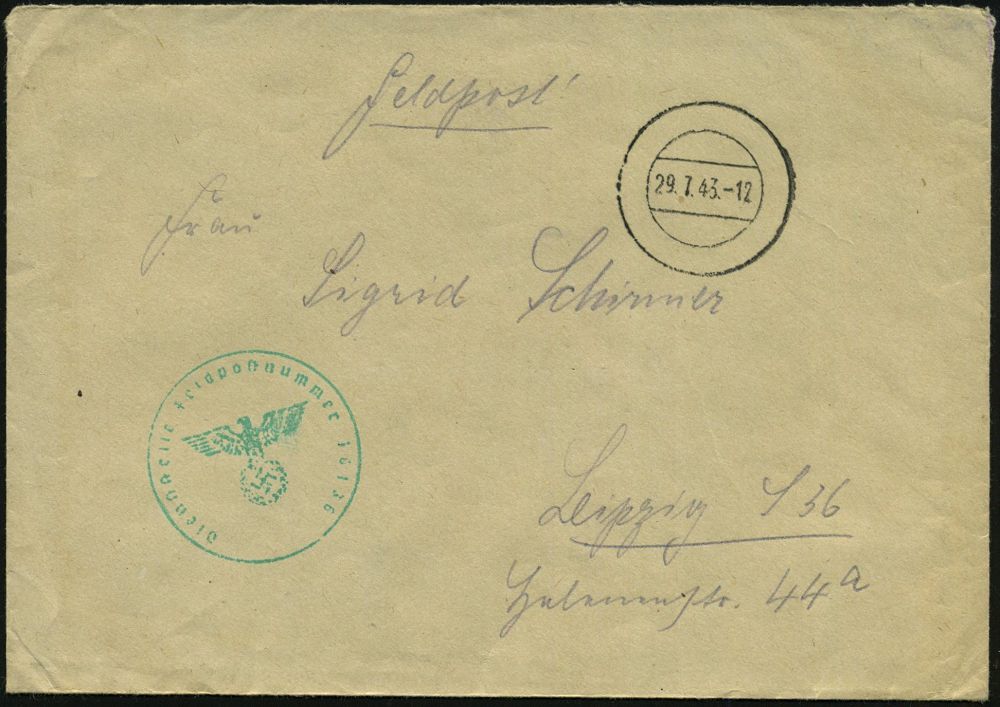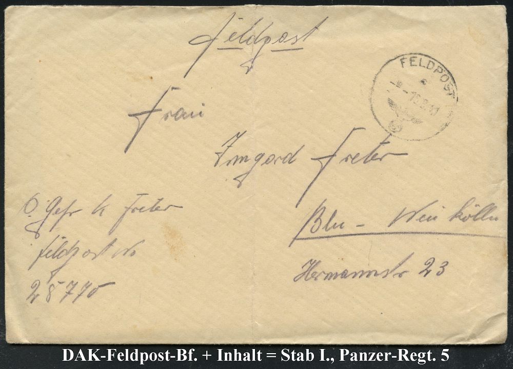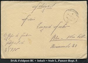 2149 | 14 € | II. WELTKRIEG (1939 - 1945) : DIRSCHAU 2/ d 1944 (27.8.) 2K-Steg + viol. 1K-HdN: Gren. Rgt. 89 Dirschau (etw. undeul.) + rs. hs. Fp.-Nr. 11 478 = Gren. Rgt. 89, Feldpost-Faltbf. m. Inhalt n. München | ![]() ![]() | |