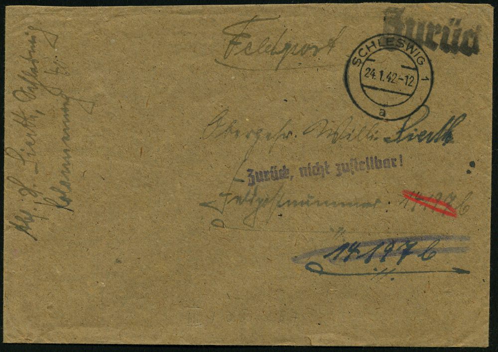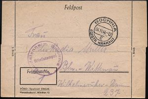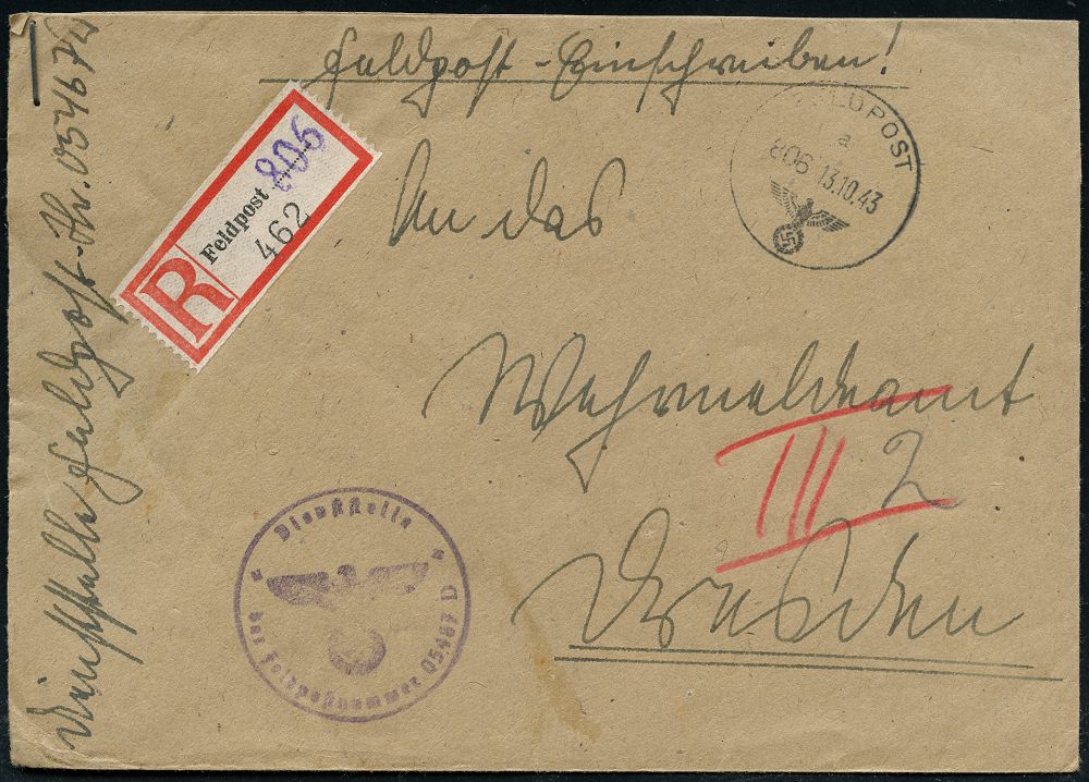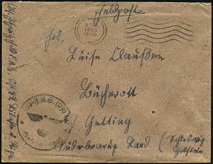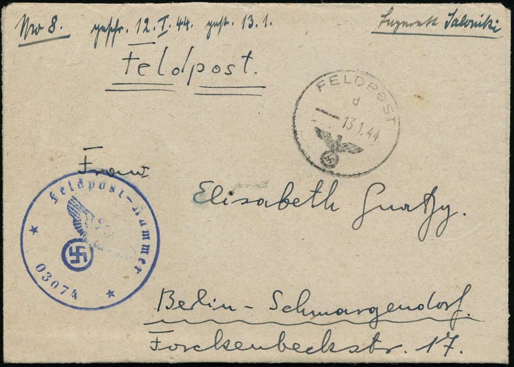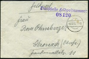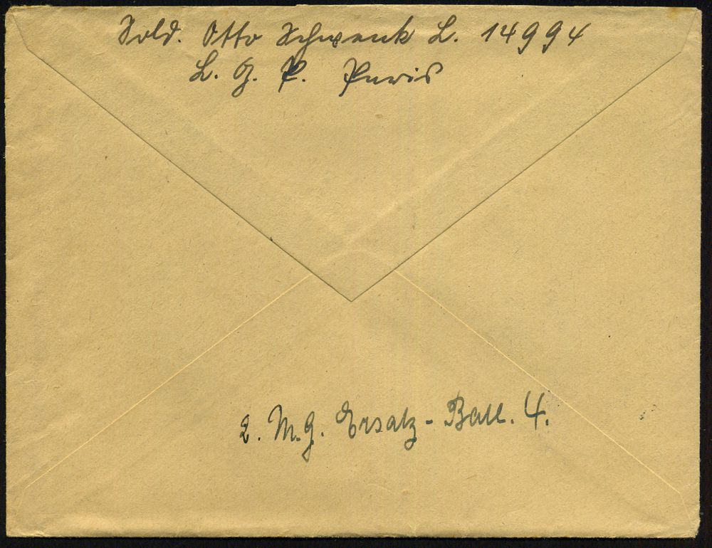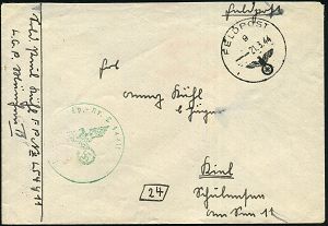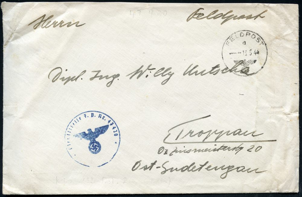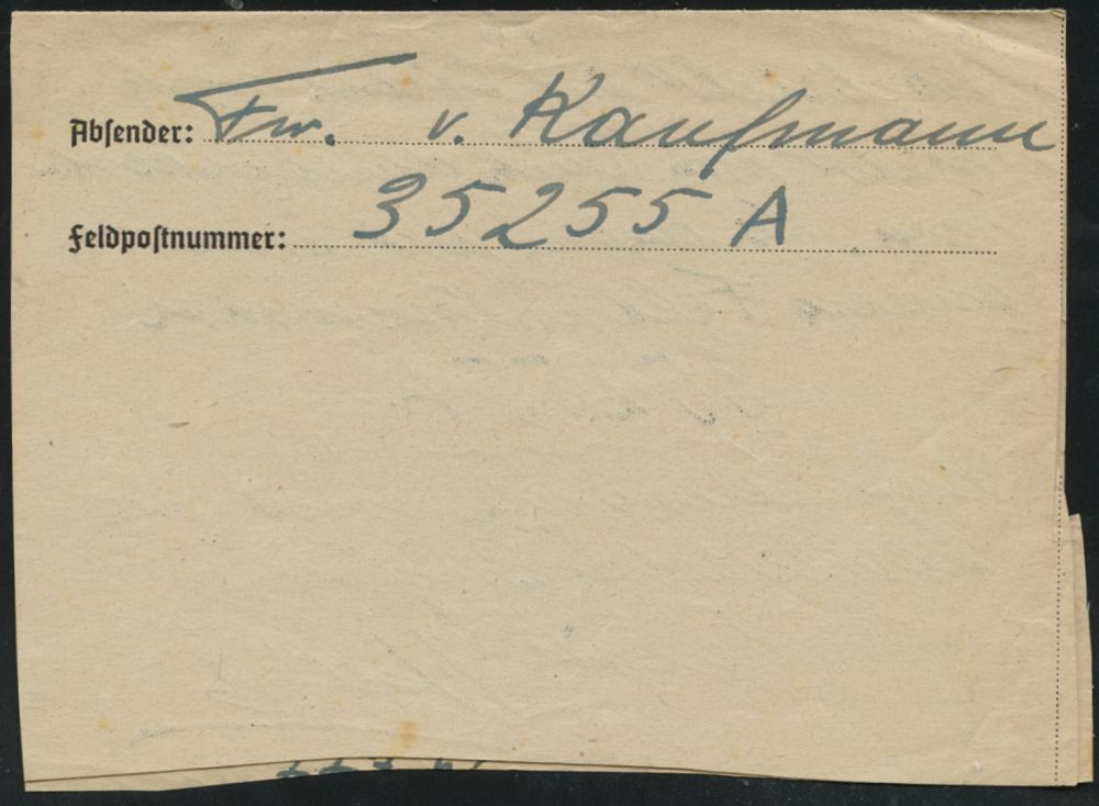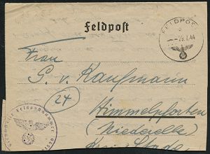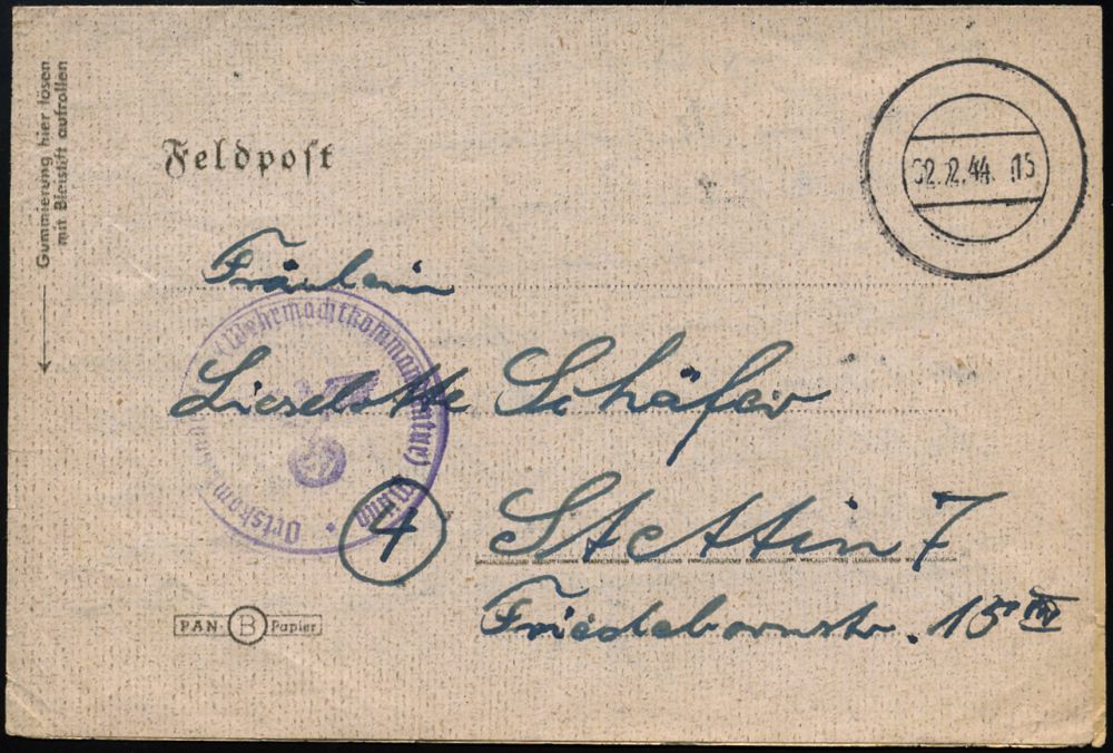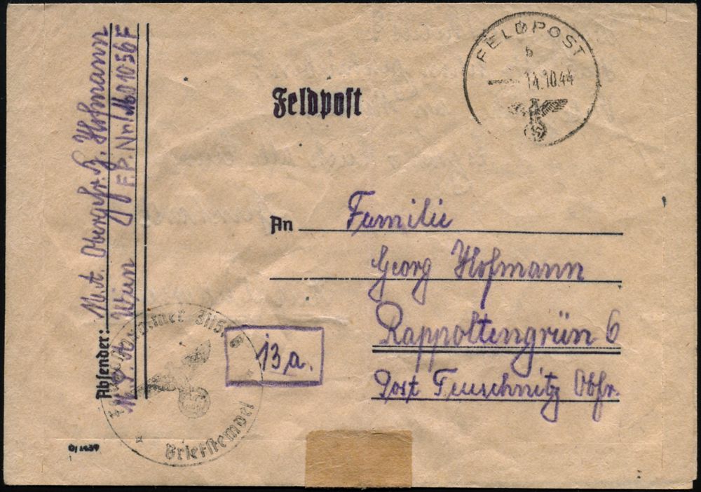 2149 | 14 € | II. WELTKRIEG (1939 - 1945) : DIRSCHAU 2/ d 1944 (27.8.) 2K-Steg + viol. 1K-HdN: Gren. Rgt. 89 Dirschau (etw. undeul.) + rs. hs. Fp.-Nr. 11 478 = Gren. Rgt. 89, Feldpost-Faltbf. m. Inhalt n. München | ![]() ![]() | |
