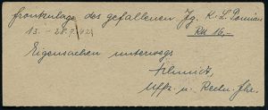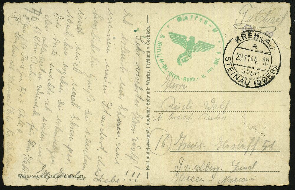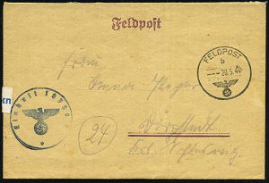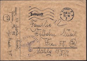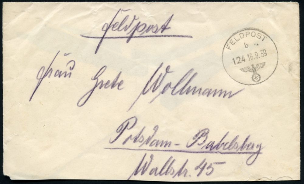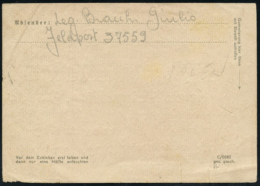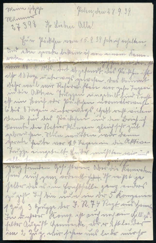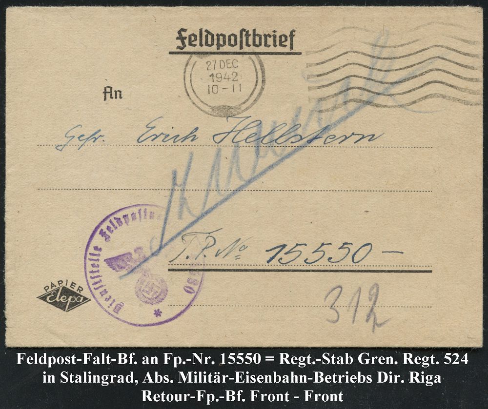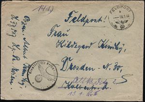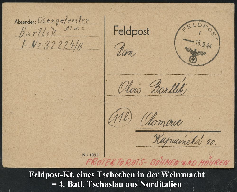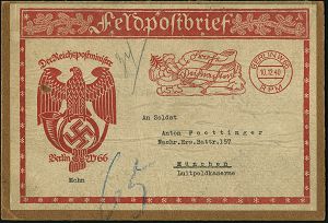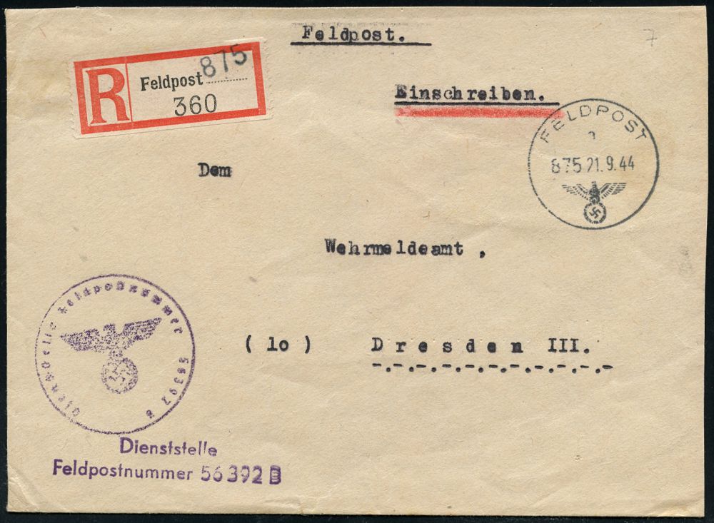 2149 | 14 € | II. WELTKRIEG (1939 - 1945) : DIRSCHAU 2/ d 1944 (27.8.) 2K-Steg + viol. 1K-HdN: Gren. Rgt. 89 Dirschau (etw. undeul.) + rs. hs. Fp.-Nr. 11 478 = Gren. Rgt. 89, Feldpost-Faltbf. m. Inhalt n. München | ![]() ![]() | |