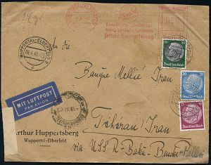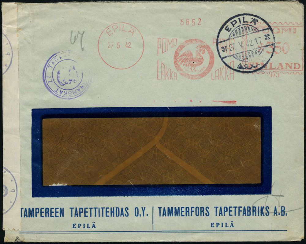 2541 | 20 € | II. WELTKRIEG (1939 - 1945) : FINNLAND 1942 (27.5.) AFS Francotyp: EPILÄ/POMO/LAKKA/475 = Tammerfors Tapetenfabriks A.B. (Hahn) + 1K-Gitter: EPILÄ + finn. Zensur-3K: 77 (teils undeutl.) + OKW-Zensurstreifen + roter 1K: Geprüft/b/ "T" = Transit-Zensur Berlin! (Rie.B-7 a, 100 Pkte., B-55) Ausl.-Zensur-Bf. (Francotyp CAh) | ![]() ![]() | |