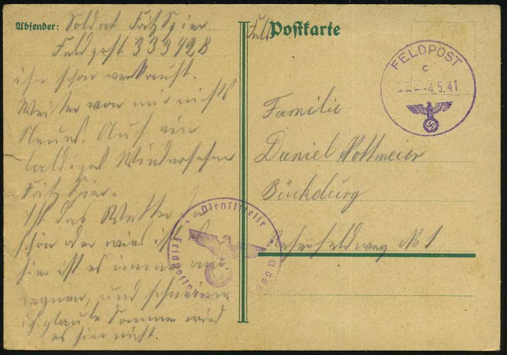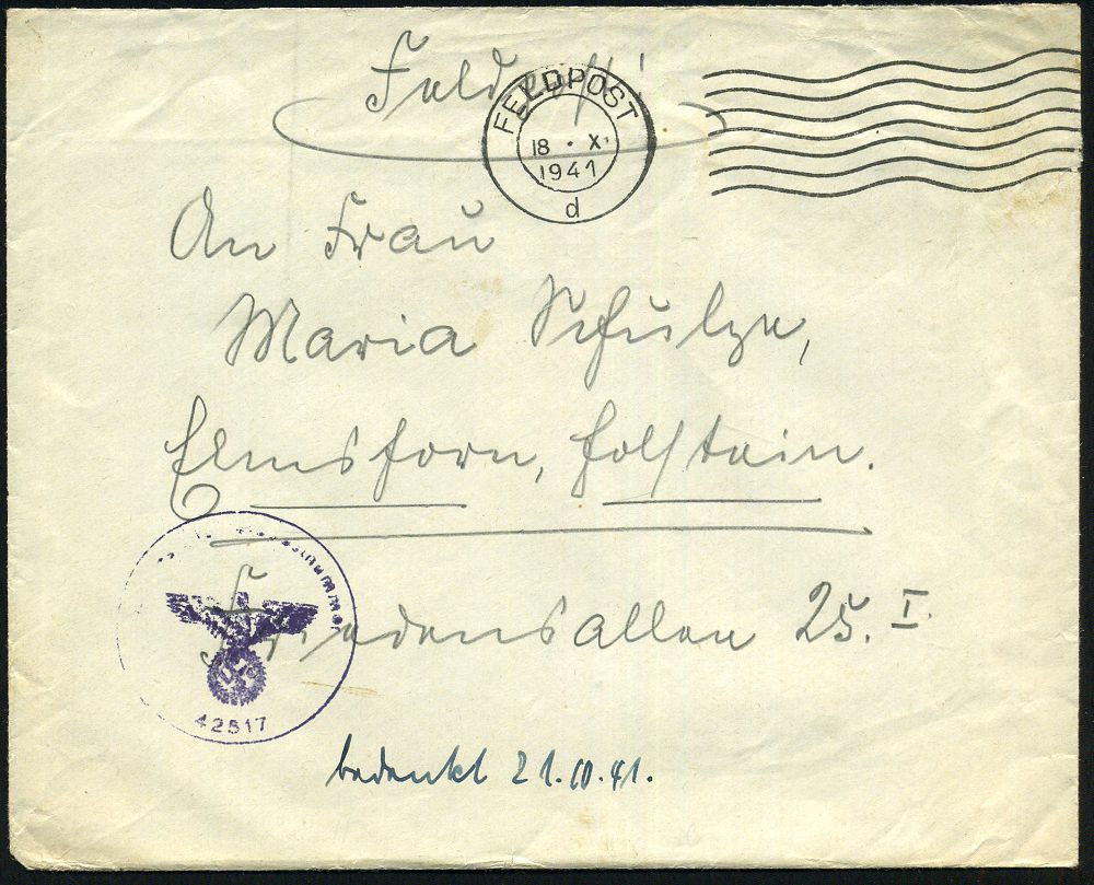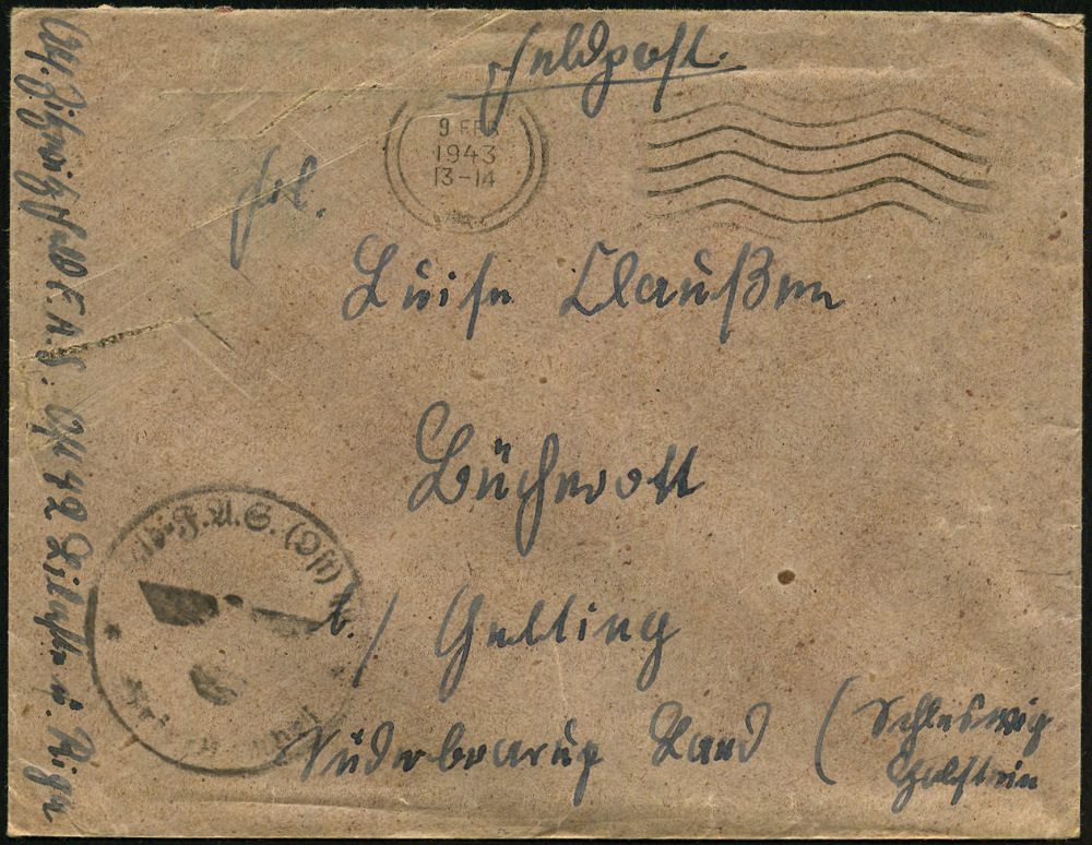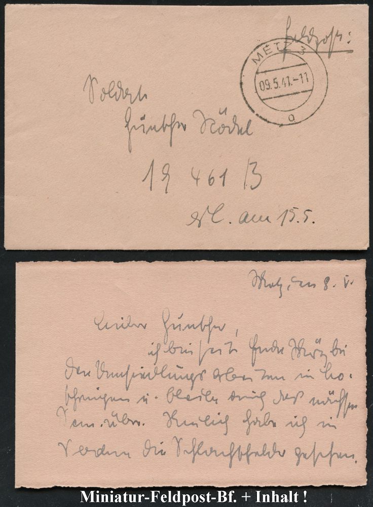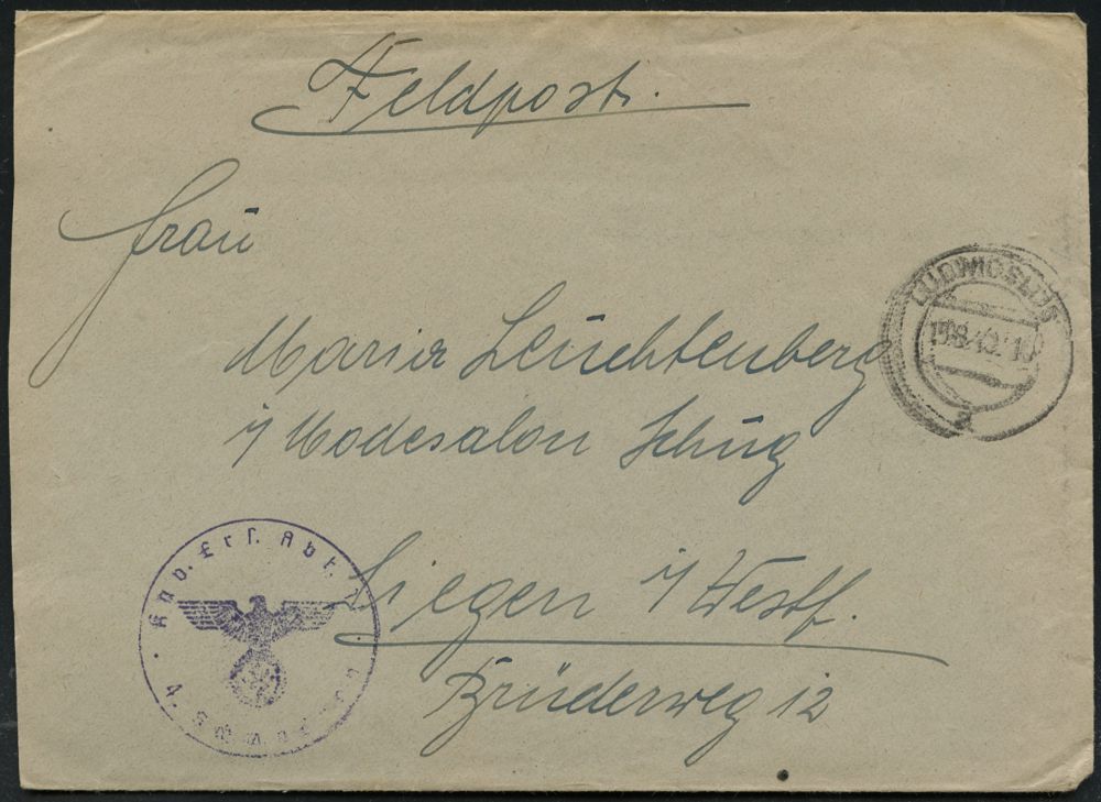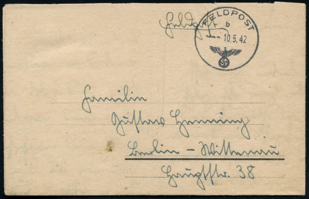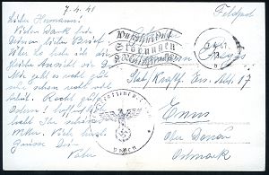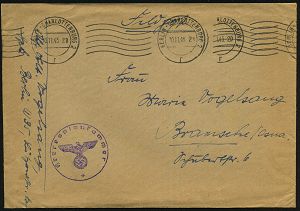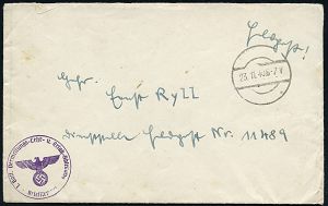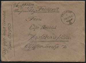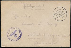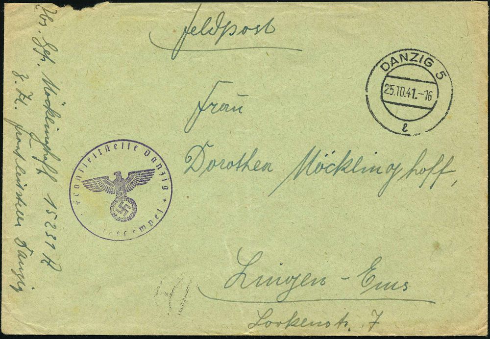 2148 | 16 € | II. WELTKRIEG (1939 - 1945) : DANZIG 5/ l 1941 (25.10.) 2K-Steg + viol. 1K-HdN: Frontleitstelle Danzig + hs. Abs. Fp.-Nr.: 15 231 A = Inf. Rgt. 37, klar gest. Feldpost-Bf. + Inhalt (oben kl. Kerbe) n. Lingen/Ems, siehe auch Sektion: DANZIG | ![]() | |