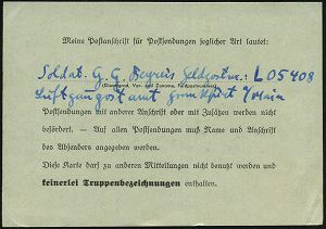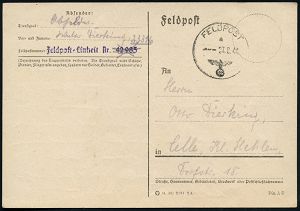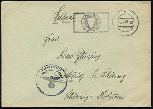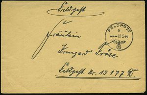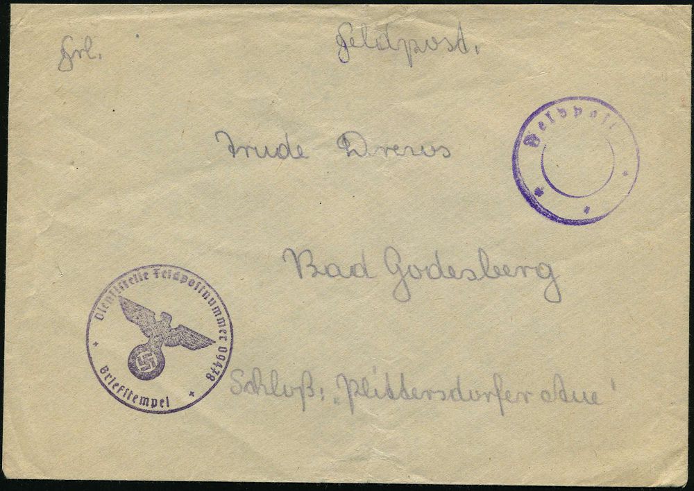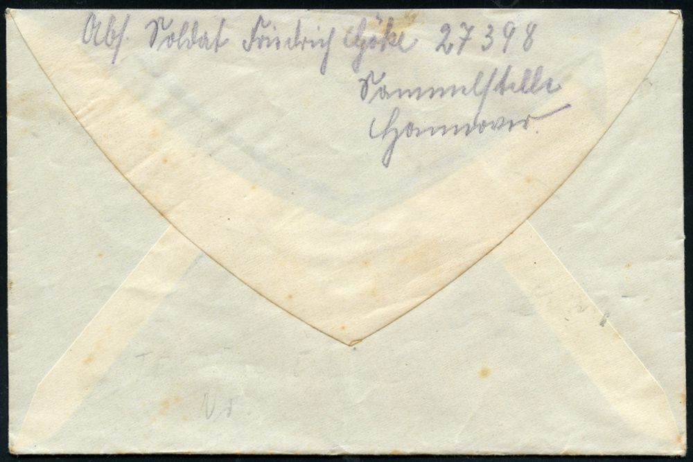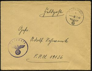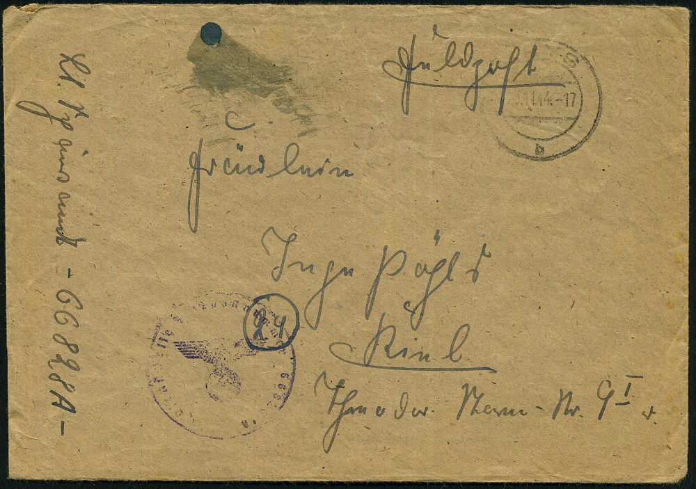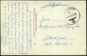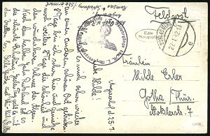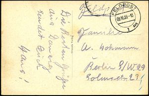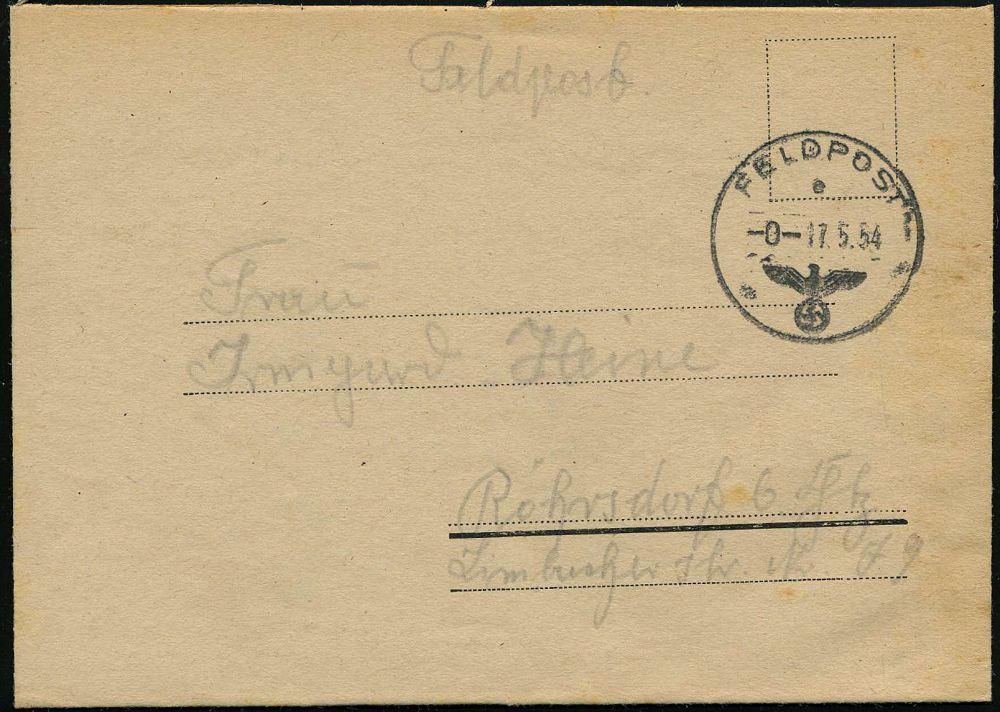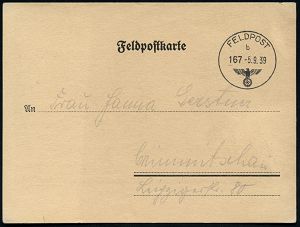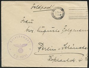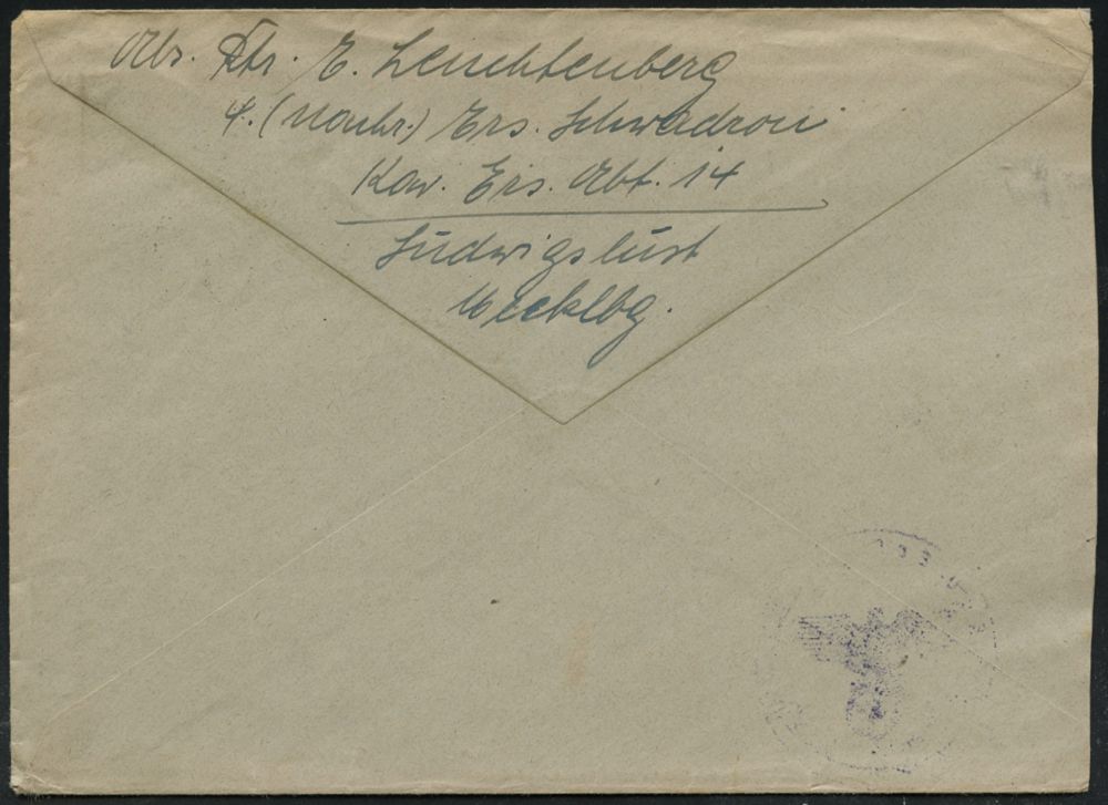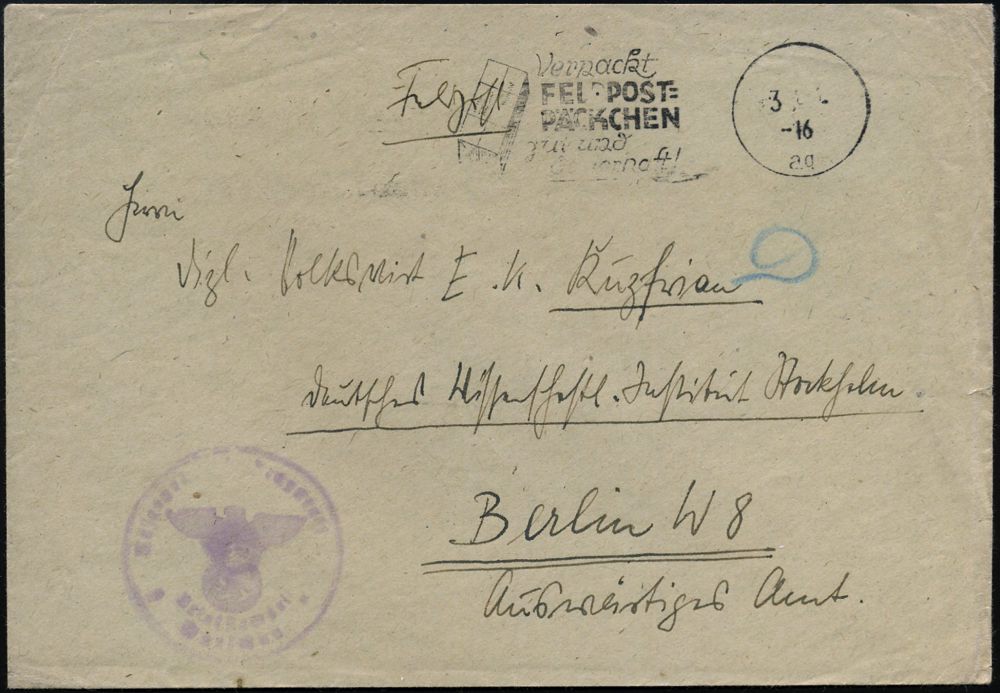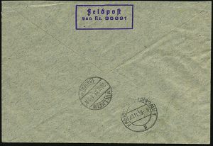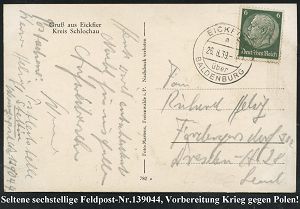 2156 | 65 € | II. WELTKRIEG (1939 - 1945) : EICKFIER/ a/ über/ BALDENBURG 1939 (26.8.) 2K-Steg = PSt. I auf EF 6 Pf. Hindenbg. + handschr. Abs. "..Postleitstelle Stettin, Übungsnummer 1 3 9 0 4 4 " = sechstellige Fp.-Nr. kurz vor der Invasion Polens! , sechstellige Fp.-Nrn. wurden aufgegeben und zum Kriegsanfang durch fünfstellige Fp.-Nrn. ersetzt, seltene frankierte s/w.-Feldpost-Ak.: Eickfier (3 Ansichten) , seltener Feldpost-Beleg!, vergl. Los Nr. 2141 (Mi.5, + 150.- EUR, 2009) | ![]() ![]() | |