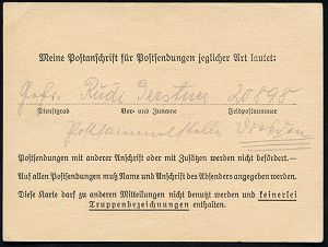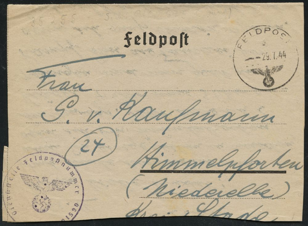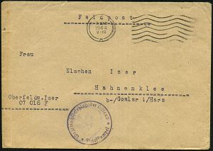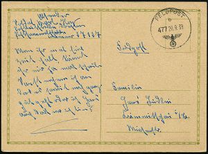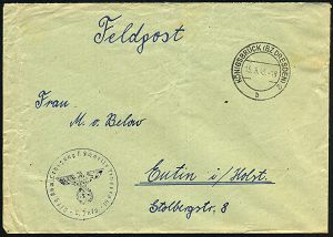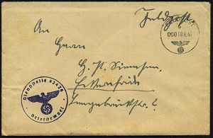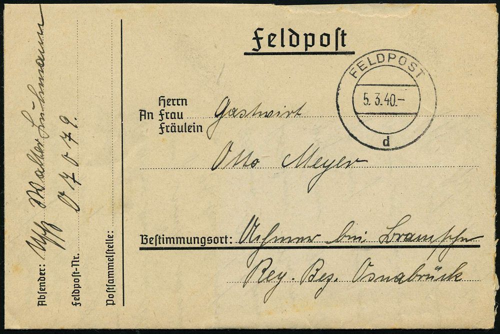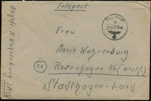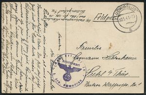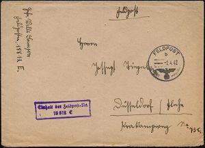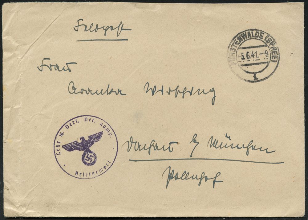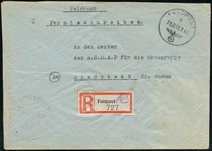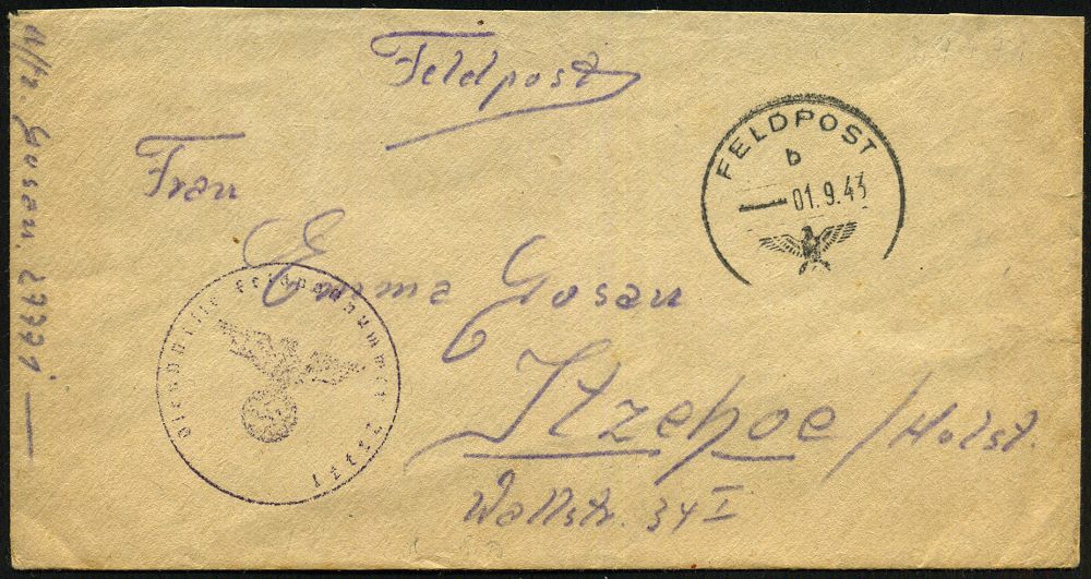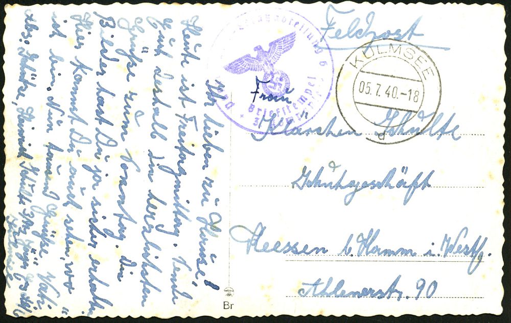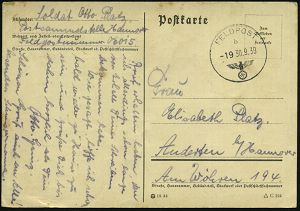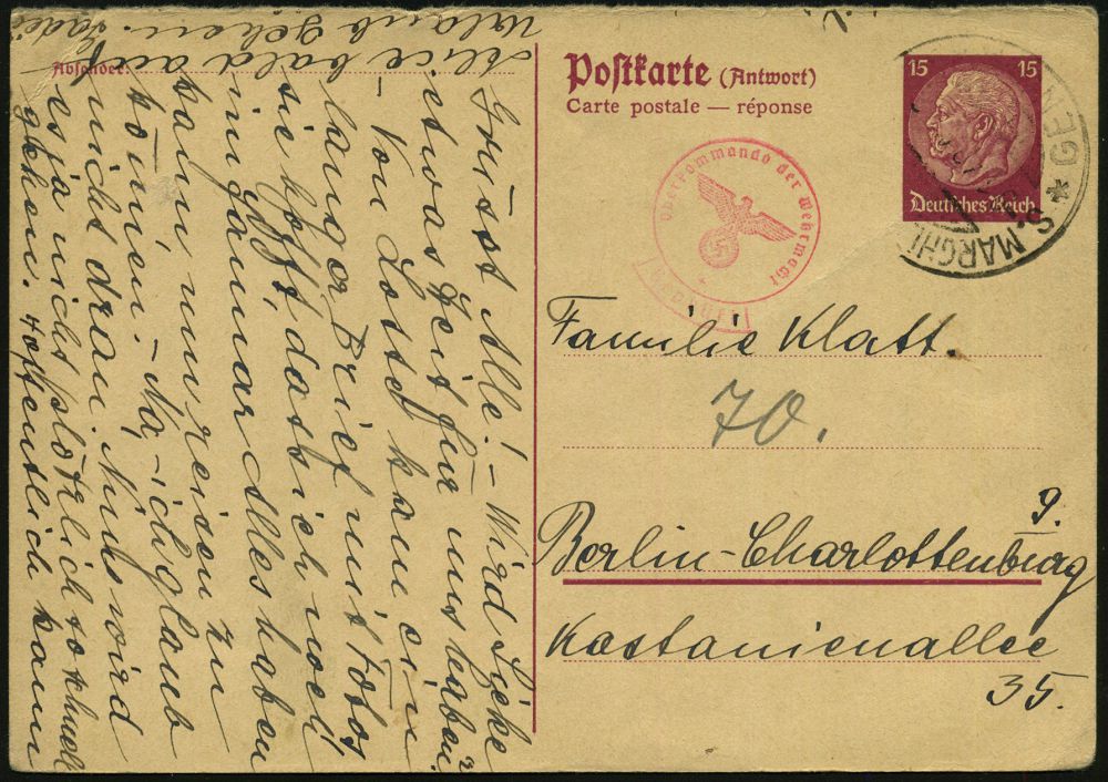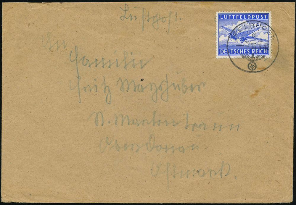 2156 | 65 € | II. WELTKRIEG (1939 - 1945) : EICKFIER/ a/ über/ BALDENBURG 1939 (26.8.) 2K-Steg = PSt. I auf EF 6 Pf. Hindenbg. + handschr. Abs. "..Postleitstelle Stettin, Übungsnummer 1 3 9 0 4 4 " = sechstellige Fp.-Nr. kurz vor der Invasion Polens! , sechstellige Fp.-Nrn. wurden aufgegeben und zum Kriegsanfang durch fünfstellige Fp.-Nrn. ersetzt, seltene frankierte s/w.-Feldpost-Ak.: Eickfier (3 Ansichten) , seltener Feldpost-Beleg!, vergl. Los Nr. 2141 (Mi.5, + 150.- EUR, 2009) | ![]() ![]() | |