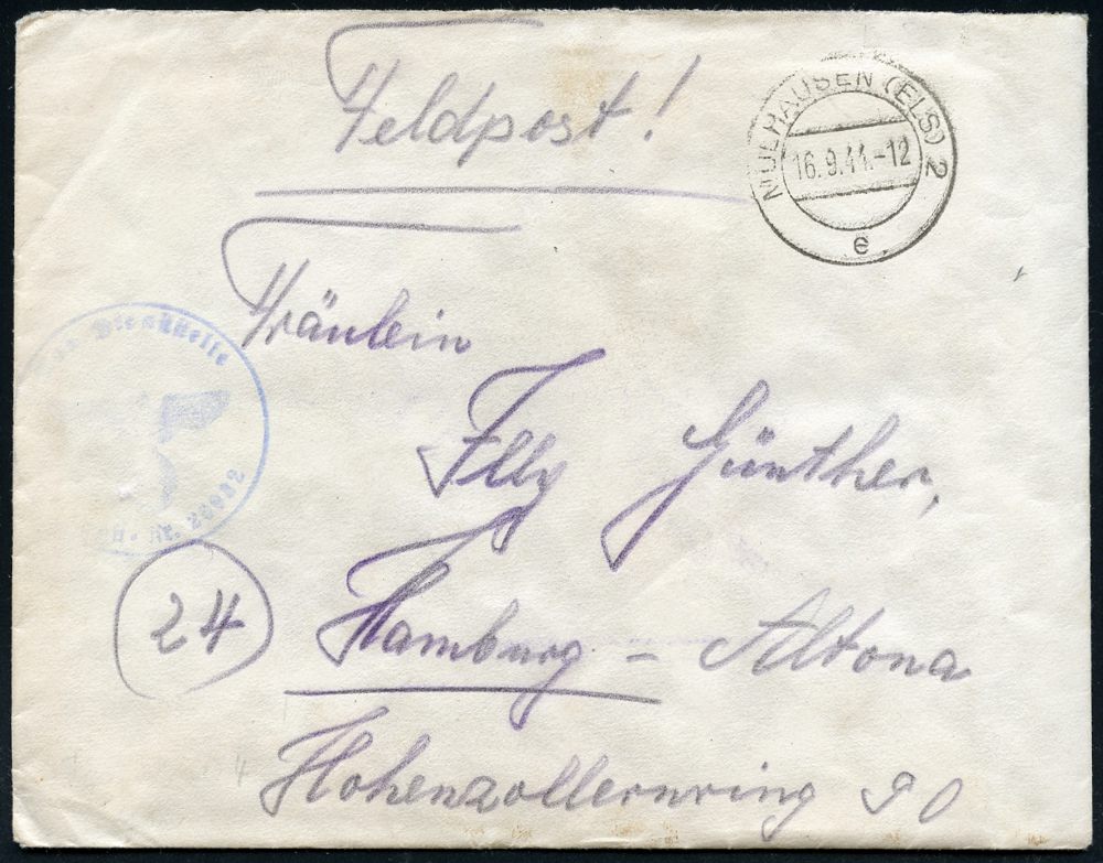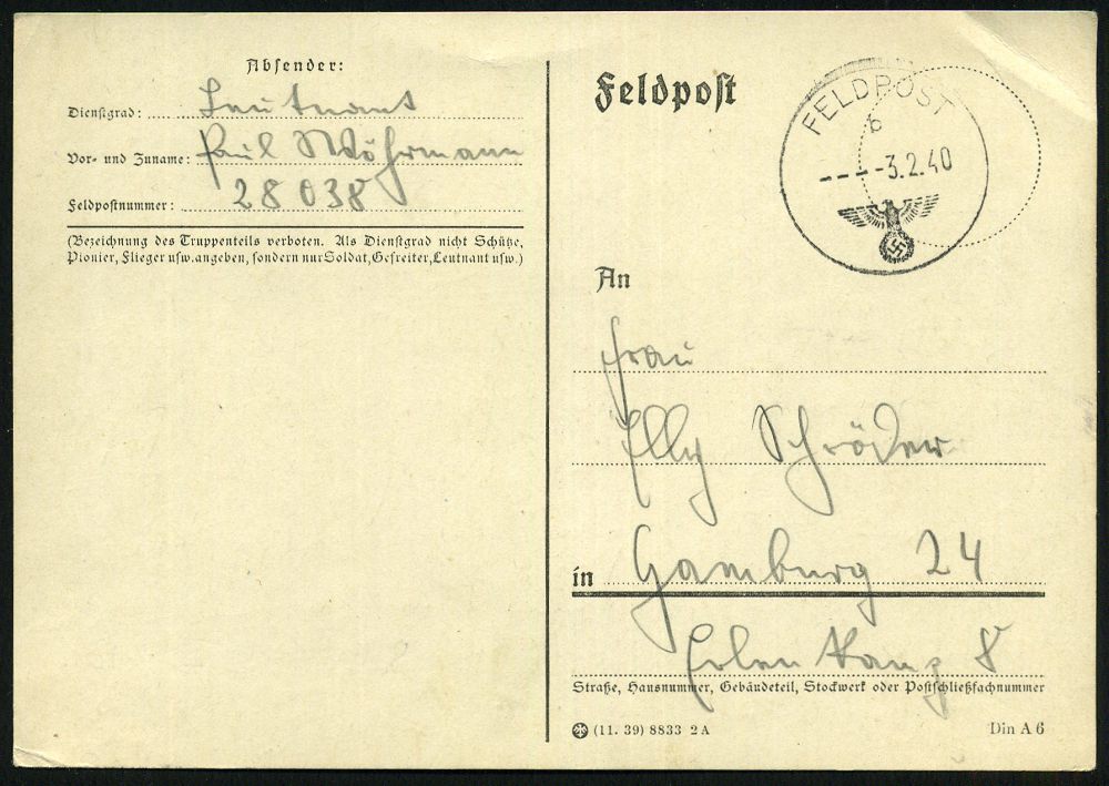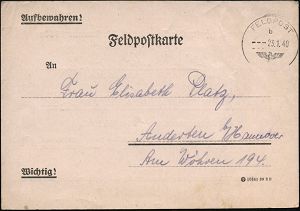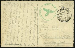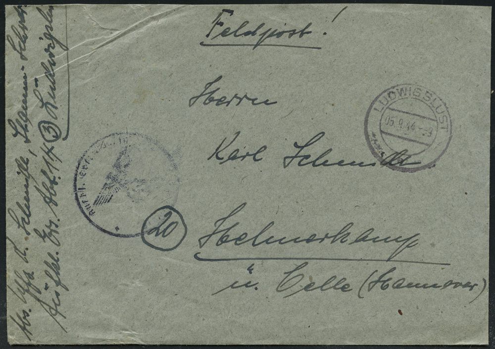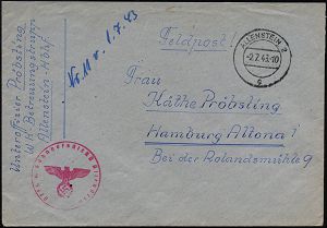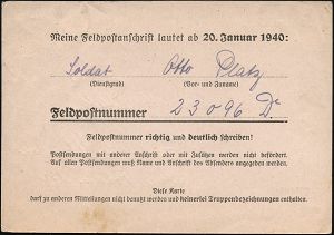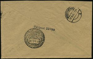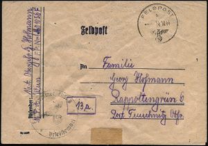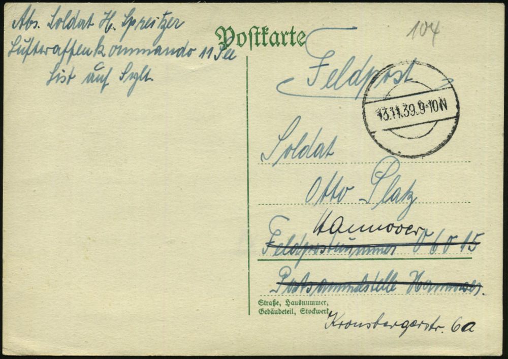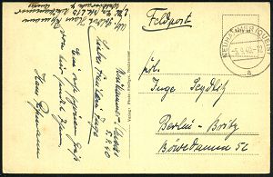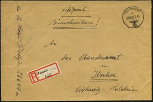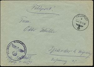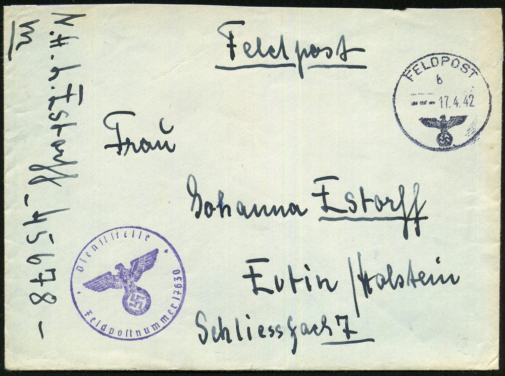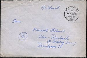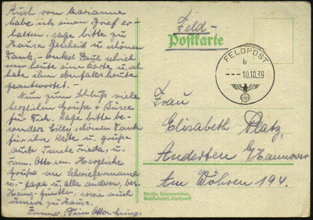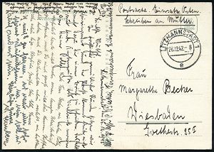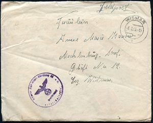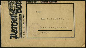 2156 | 65 € | II. WELTKRIEG (1939 - 1945) : EICKFIER/ a/ über/ BALDENBURG 1939 (26.8.) 2K-Steg = PSt. I auf EF 6 Pf. Hindenbg. + handschr. Abs. "..Postleitstelle Stettin, Übungsnummer 1 3 9 0 4 4 " = sechstellige Fp.-Nr. kurz vor der Invasion Polens! , sechstellige Fp.-Nrn. wurden aufgegeben und zum Kriegsanfang durch fünfstellige Fp.-Nrn. ersetzt, seltene frankierte s/w.-Feldpost-Ak.: Eickfier (3 Ansichten) , seltener Feldpost-Beleg!, vergl. Los Nr. 2141 (Mi.5, + 150.- EUR, 2009) | ![]() ![]() | |