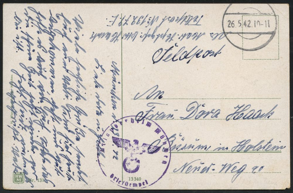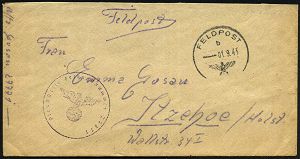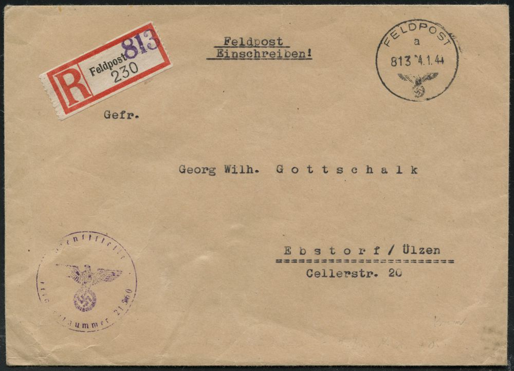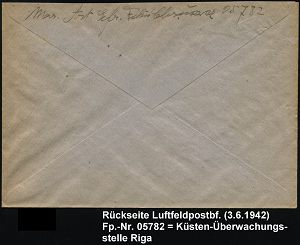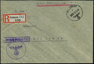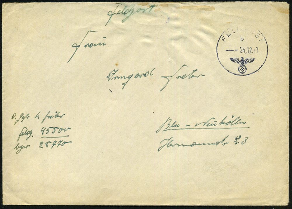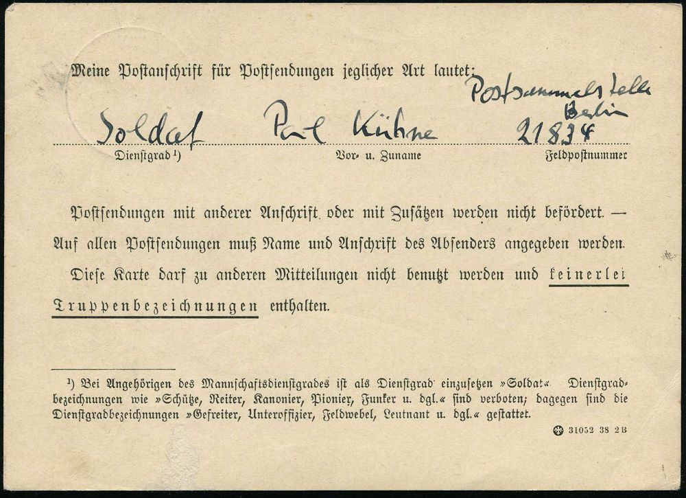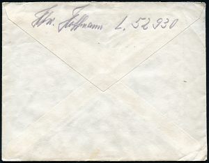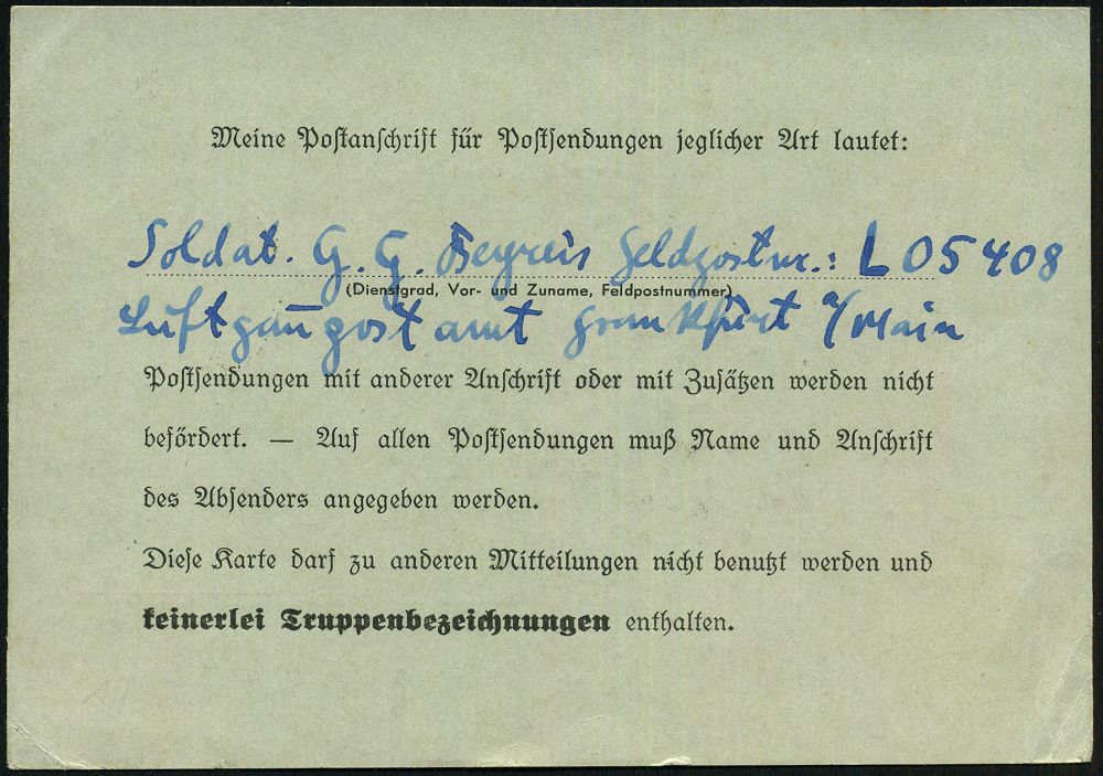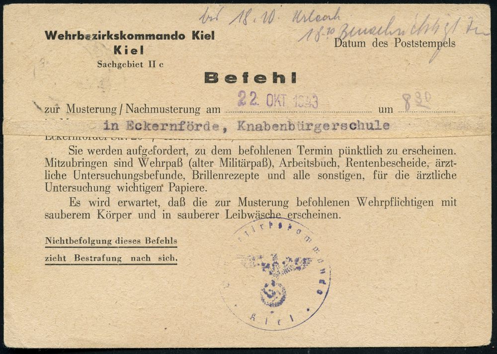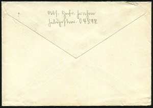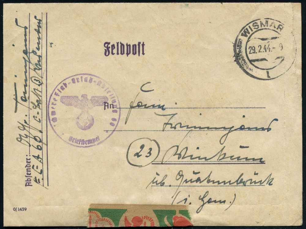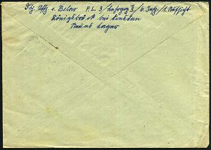 2156 | 65 € | II. WELTKRIEG (1939 - 1945) : EICKFIER/ a/ über/ BALDENBURG 1939 (26.8.) 2K-Steg = PSt. I auf EF 6 Pf. Hindenbg. + handschr. Abs. "..Postleitstelle Stettin, Übungsnummer 1 3 9 0 4 4 " = sechstellige Fp.-Nr. kurz vor der Invasion Polens! , sechstellige Fp.-Nrn. wurden aufgegeben und zum Kriegsanfang durch fünfstellige Fp.-Nrn. ersetzt, seltene frankierte s/w.-Feldpost-Ak.: Eickfier (3 Ansichten) , seltener Feldpost-Beleg!, vergl. Los Nr. 2141 (Mi.5, + 150.- EUR, 2009) | ![]() ![]() | |