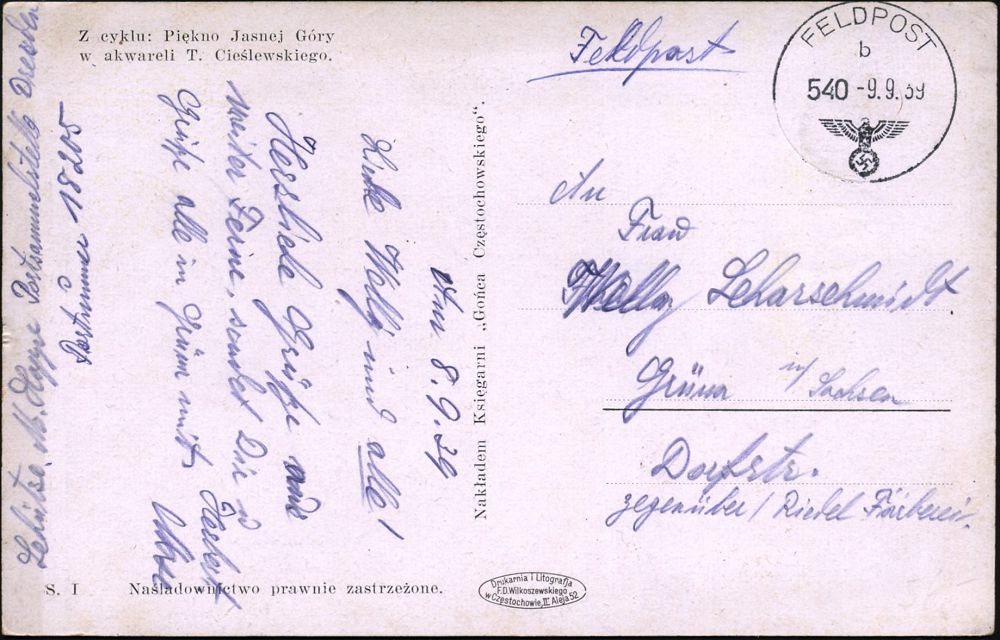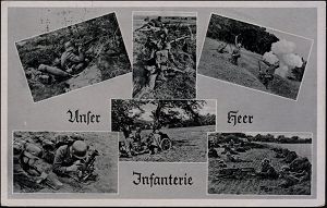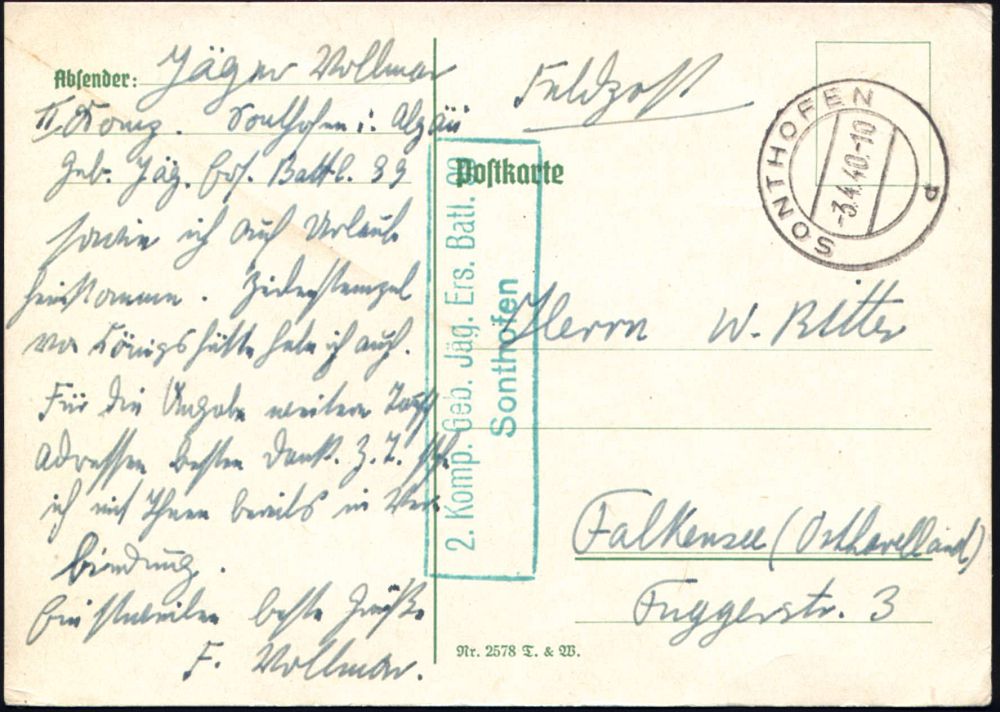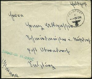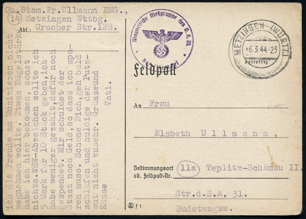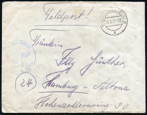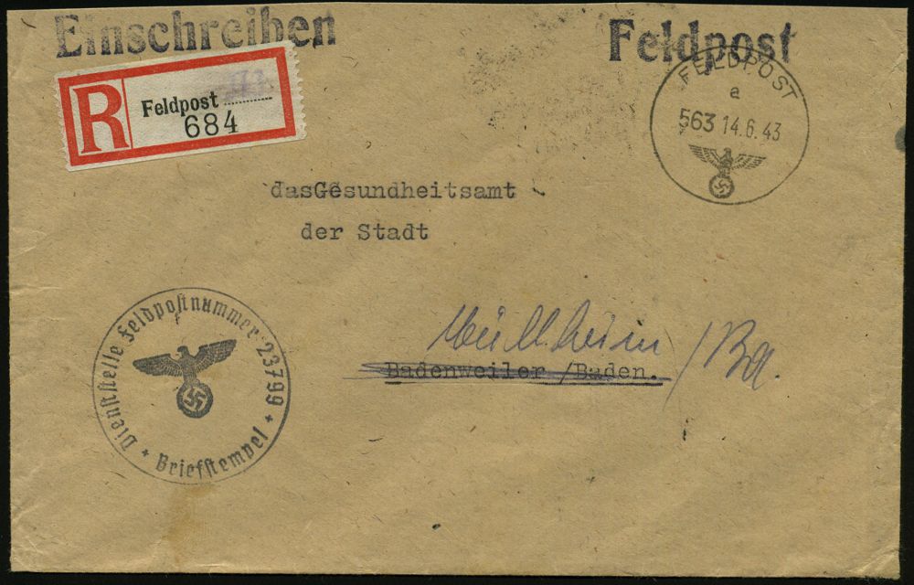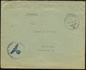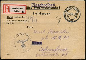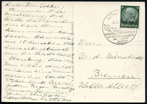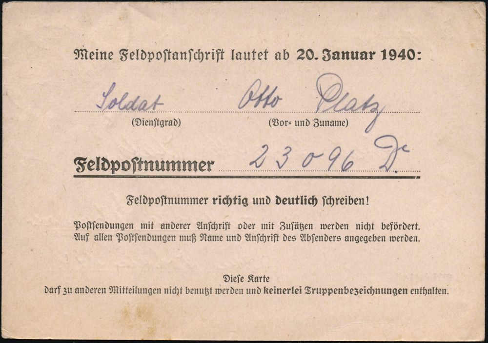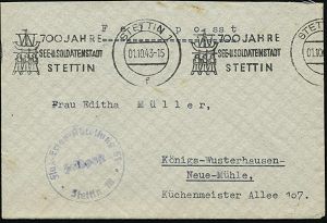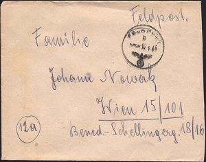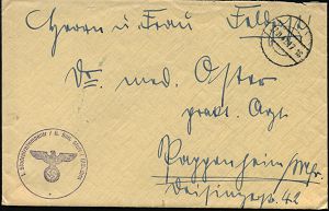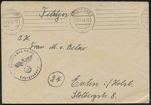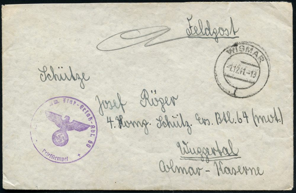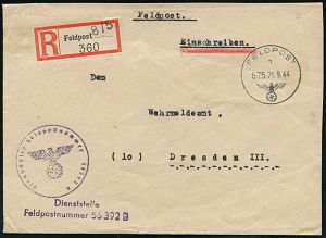 2156 | 65 € | II. WELTKRIEG (1939 - 1945) : EICKFIER/ a/ über/ BALDENBURG 1939 (26.8.) 2K-Steg = PSt. I auf EF 6 Pf. Hindenbg. + handschr. Abs. "..Postleitstelle Stettin, Übungsnummer 1 3 9 0 4 4 " = sechstellige Fp.-Nr. kurz vor der Invasion Polens! , sechstellige Fp.-Nrn. wurden aufgegeben und zum Kriegsanfang durch fünfstellige Fp.-Nrn. ersetzt, seltene frankierte s/w.-Feldpost-Ak.: Eickfier (3 Ansichten) , seltener Feldpost-Beleg!, vergl. Los Nr. 2141 (Mi.5, + 150.- EUR, 2009) | ![]() ![]() | |