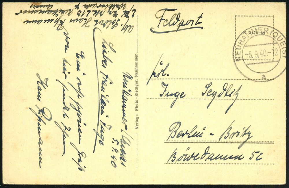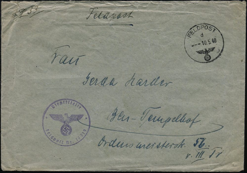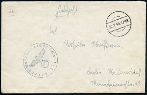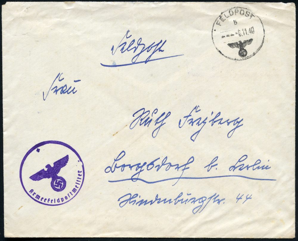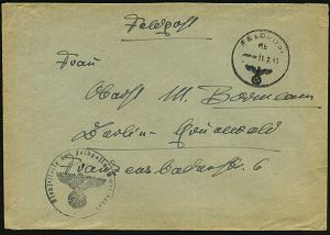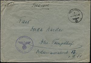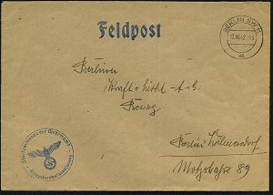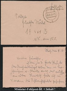 2098 | 12 € | II. WELTKRIEG (1939 - 1945) : Berlin-Treptow 1940 (30.9.) stumme 1K-Brücke = Tarnstempel Berlin-Treptow + viol. 1K-HdN: Heeres-Waffenmeisterschule/3 , klar gest. Feldpost-Bf. + Inhalt n. Bln-Wilmersdorf, 2 Belege kompl. | ![]() | |