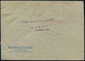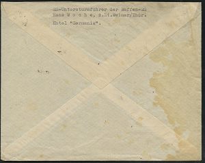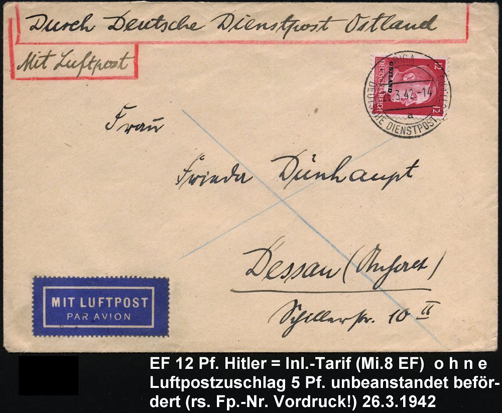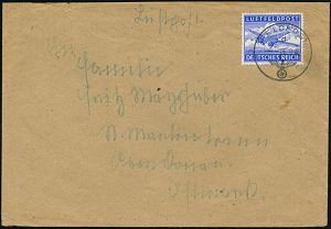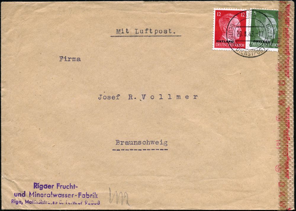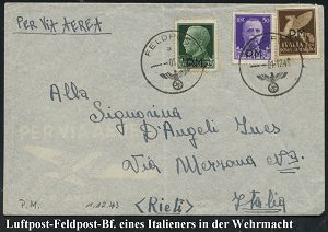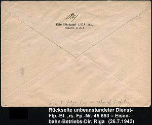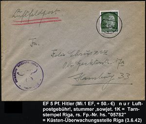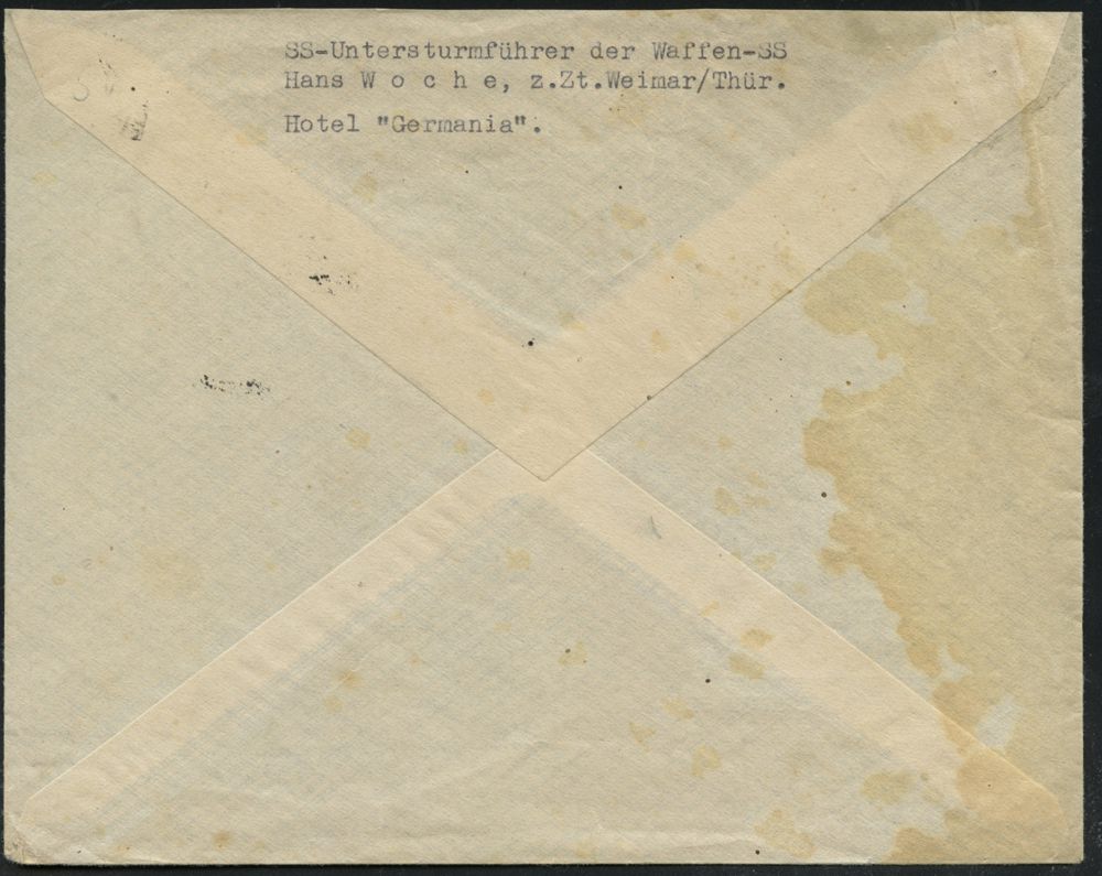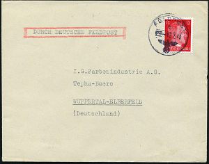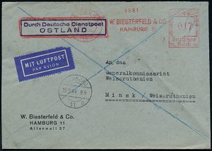 2531 | 45 € | II. WELTKRIEG (1939 - 1945) : DT.BES.WEISSRUSSLAND 1944 (13.5.) AFS Francotyp "Hakenkreuz": HAMBURG/11/W. BIESTERFELD & CO... 017 Pf. + 1K-Brücke: HAMBURG/11/c + Ra.2: Durch Deutsche Dienstpost/ OSTLAND , Firmen-Luftpost-Ausl.-Bf. o h n e Zensur (mit Lufthansa) an Generalkommissariat Weissruthenen in Minsk, Weißrußland, sehr seltene Portostufe = Europa-Tarif! (Dü.E-3CEh) | ![]() | |