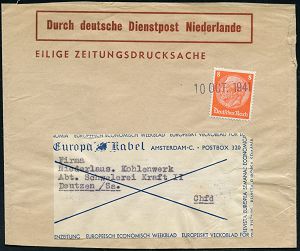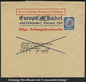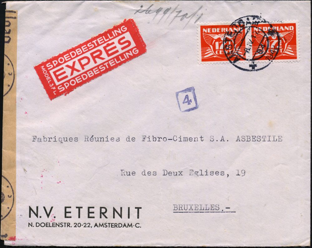 2559 | 15 € | II. WELTKRIEG (1939 - 1945) : NIEDERLANDE 1942 (8.4.) 17 1/2 C. Taube, Paar + 2K-Steg: AMSTERDAM/64 + OKW-Transit-Zensurzettel + roter 1K: c/31/Geprüft = Köln (Rie.C-5 d, C-55) Firmen--Bf.: N.V. ETERNIT, Ausl.-Zensur-Eil-Bf. n. Brüssel (Mi.385 MeF) | ![]() ![]() | |