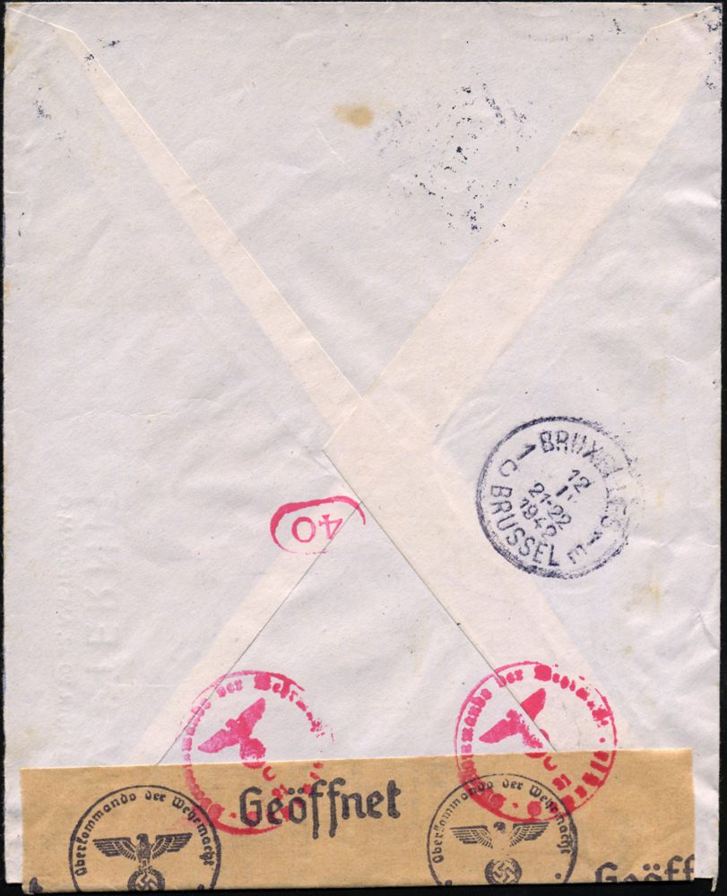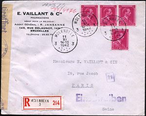 2536 | 15 € | II. WELTKRIEG (1939 - 1945) : BELGIEN 1942 (11.11.) 1 Fr. Leopold, reine MeF: 4 Stück, 1K + provis. RZ: MOLENBEEK + OKW-Zensurstreifen "c" + roter 1K (= Köln, Rie.C-55 etc.) als Transit-Zensur auf Ausl.-Zensur-Bf. (Pharma-Firma Vaillant) n. Paris (Mi.424 MeF) | ![]() | |