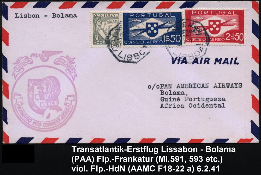 2563 | 25 € | II. WELTKRIEG (1939 - 1945) : PORTUGAL 1941 (6.2.) Erstflug (PAA): Lisboa - Bolama / Port. Guinea (rs. AS) Flp. 1,50 E. u. 2,50 E. (Mi.591, 593 u.a.) lila PAA-HdN, seltener Kriegs-Erstflug! (AAMC F 18-22 a) | ![]() ![]() | |