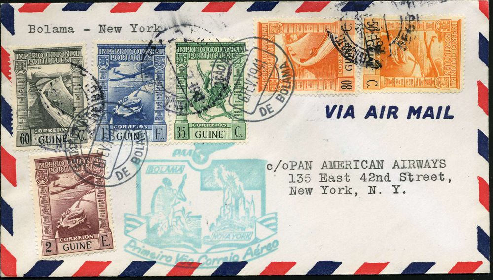 2567 | 25 € | II. WELTKRIEG (1939 - 1945) : PORTUG.GUINEA 1941 (6.2.) Erstflug (PAA): Bolama - New York (rs. AS) schöne Flp.-Frankatur (Mi.243/45 u.a.) grüner HdN: PAA/BOLAMA/ NOVA YORK/Primeiro Voo.. (Liberty-Statue etc.), seltener Kriegs-Transatlantik-Erstflugbf. (Mu.3 / AAMC.F 18-23) | ![]() | |