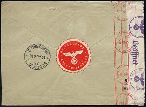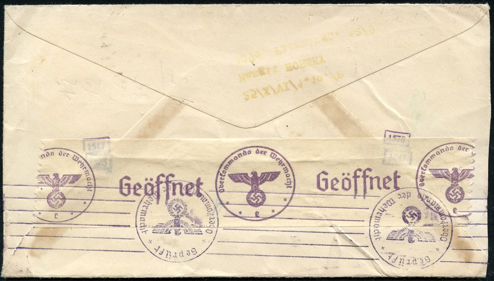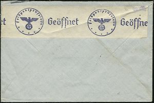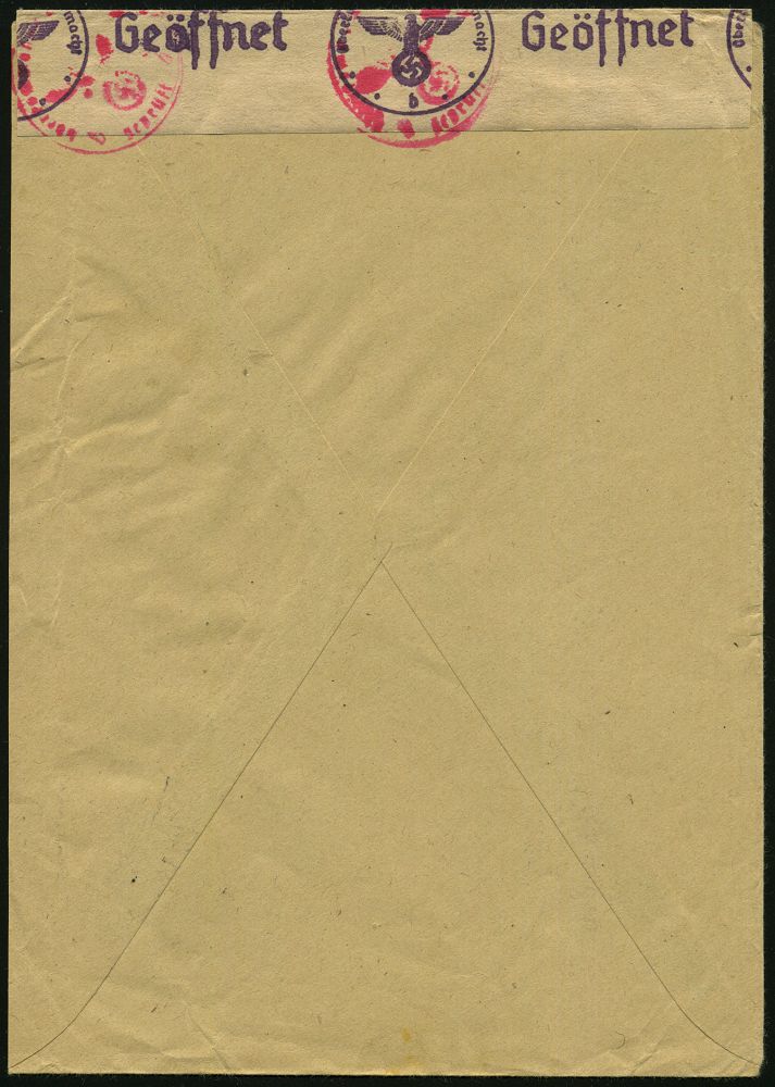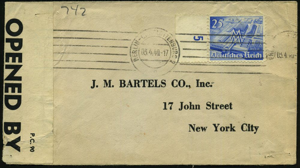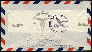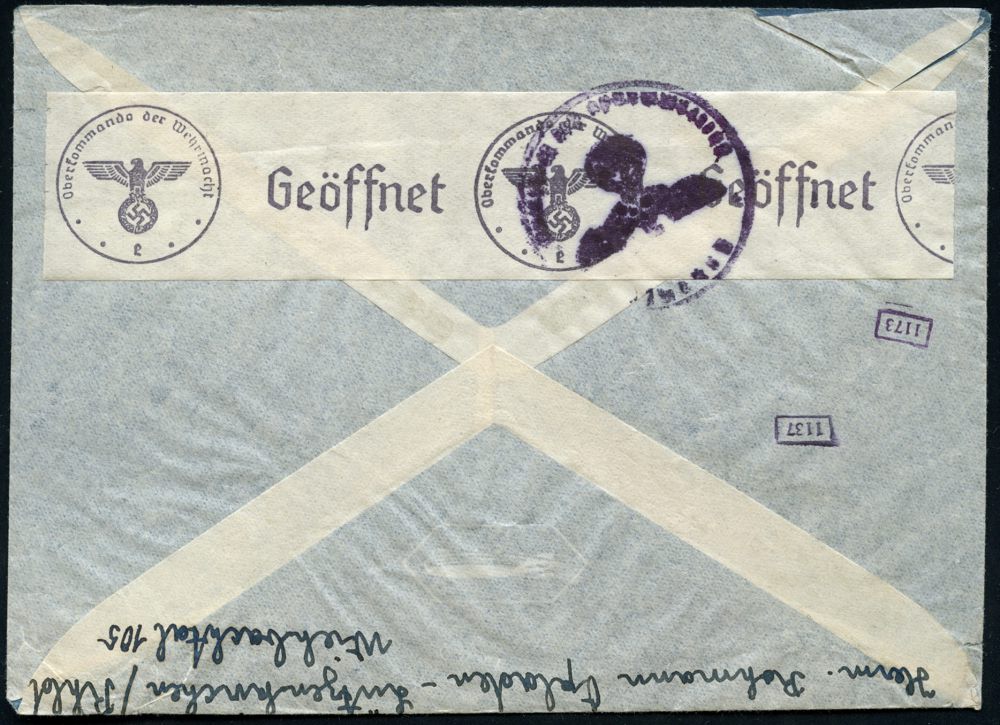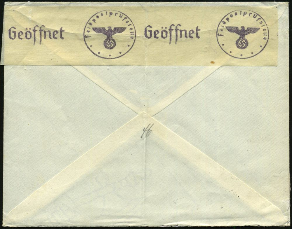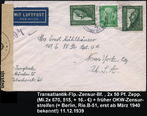2095 | 28 € | II. WELTKRIEG (1939 - 1945) : BERLIN-CHARLOTTENBURG 2/ e 1940 (3.4.) Band-MaSt. auf EF 25 Pf. Leipz. Messe, rs. Doppel-Zensur OKW-Streifen "Geöffnet" + blauer 1K: Geprüft = Frankfurt/M. (Rie.E-2 a, E-50, zus. 100 Pkte.) + brit. Zensurstreifen: OPENED BY/EXAMINER 5355 (P.C.90) Ausl.-Doppel-Zensur-Bf. n. New York (Mi.742 EF + 75.- EUR) | ![]() ![]() | |