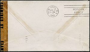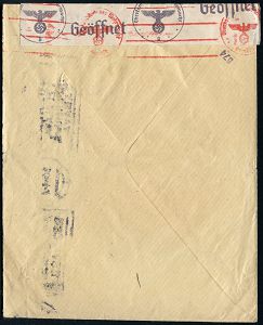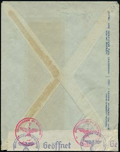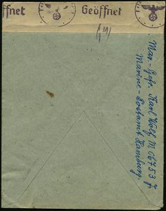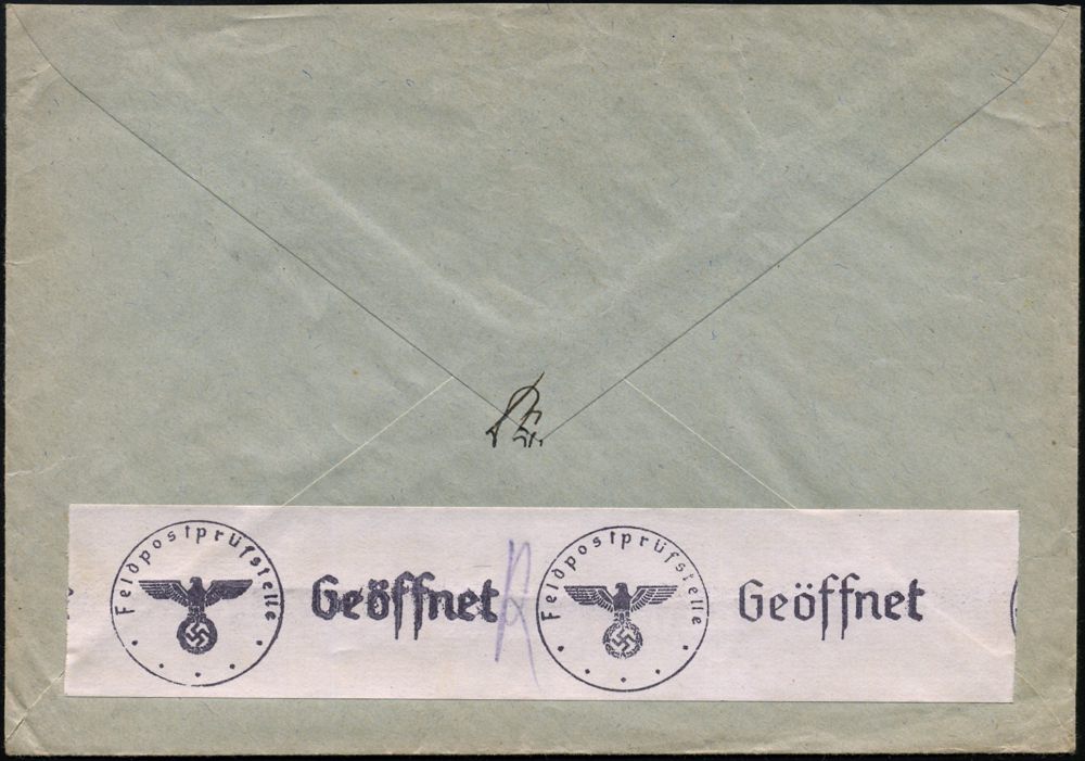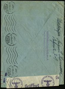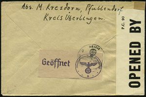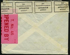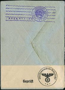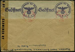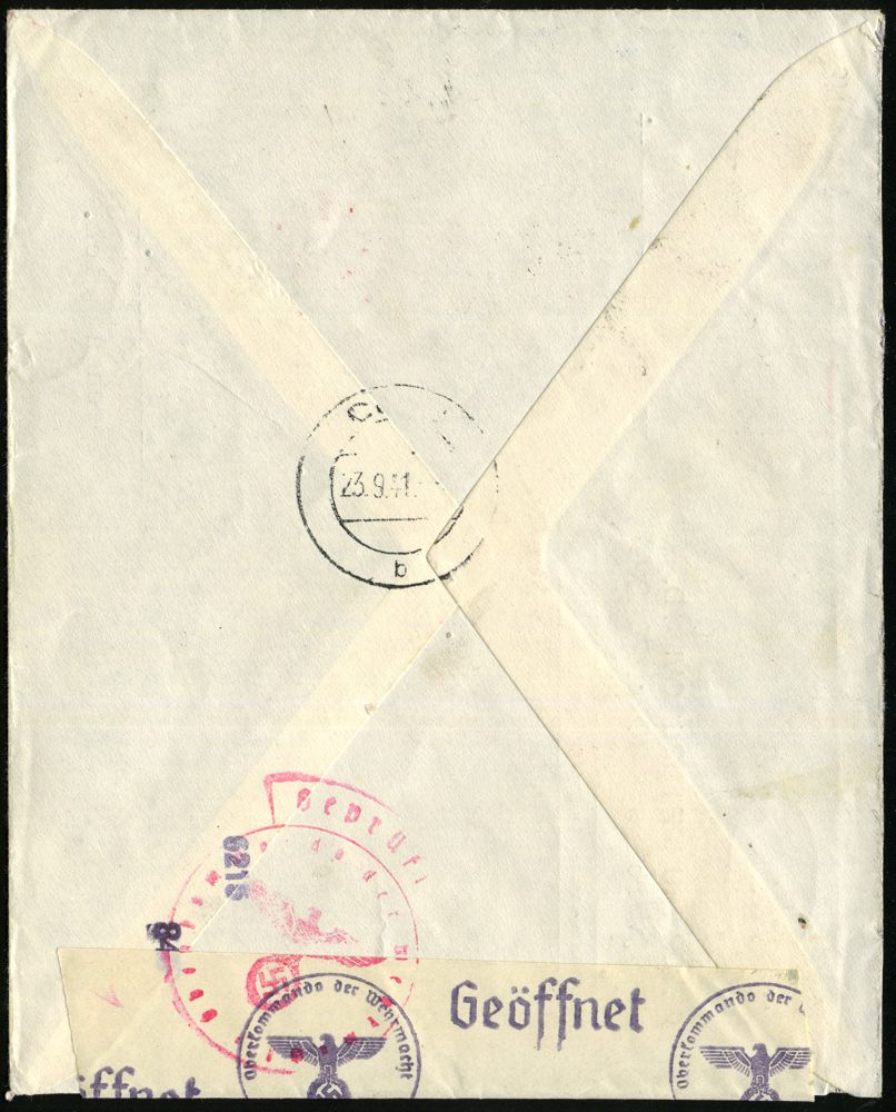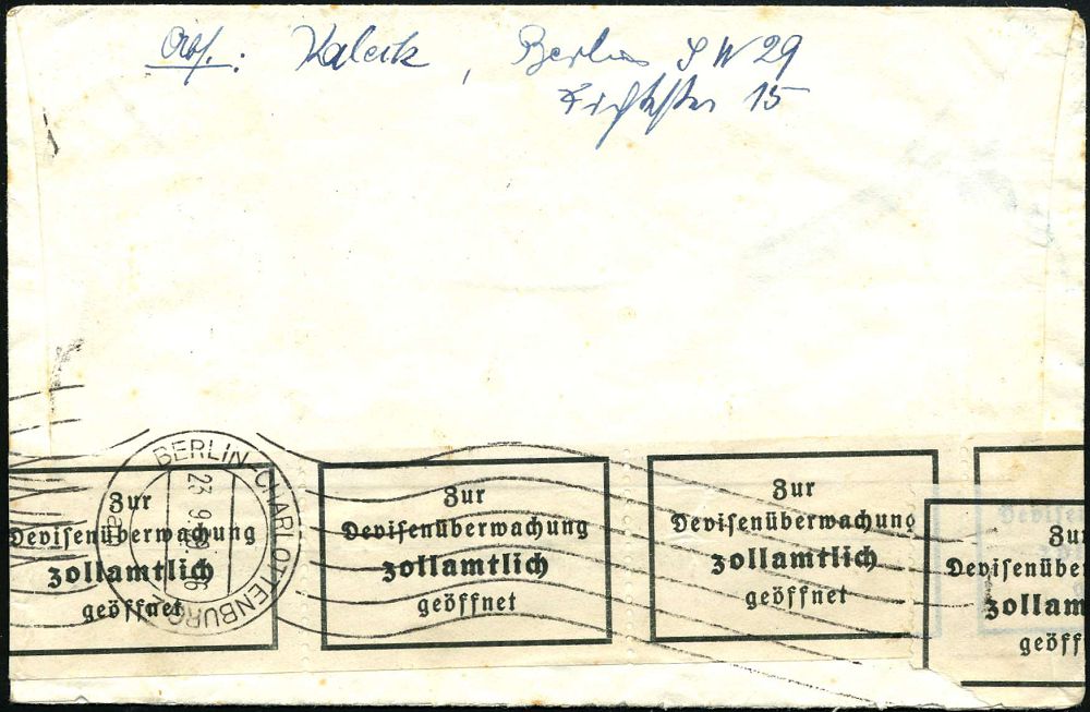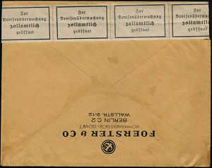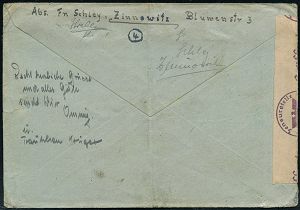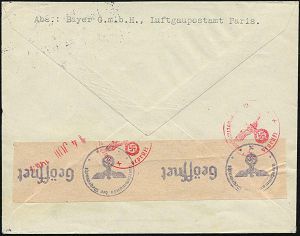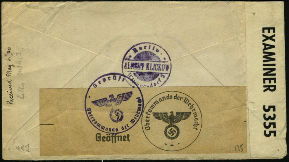 2095 | 28 € | II. WELTKRIEG (1939 - 1945) : BERLIN-CHARLOTTENBURG 2/ e 1940 (3.4.) Band-MaSt. auf EF 25 Pf. Leipz. Messe, rs. Doppel-Zensur OKW-Streifen "Geöffnet" + blauer 1K: Geprüft = Frankfurt/M. (Rie.E-2 a, E-50, zus. 100 Pkte.) + brit. Zensurstreifen: OPENED BY/EXAMINER 5355 (P.C.90) Ausl.-Doppel-Zensur-Bf. n. New York (Mi.742 EF + 75.- EUR) | ![]() ![]() | |