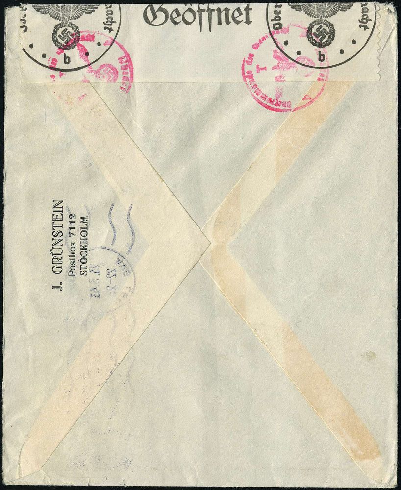 2570 | 18 € | II. WELTKRIEG (1939 - 1945) : SCHWEDEN 1943 (23.3.) 20 Öre Gustav III., reine MeF: Paar = 150 Jahre Nationalmuseum , MaWellenSt.: STOCKHOLM 1 + OKW-Zensurstreifen "b" + roter 1K: b T b = Berlin (Rie.B-7 a, B-53 a, zus. + 120 Pkte.) Ausl.-Transit-Zensur-Flp.-Bf. in die Schweiz (Mi.291 MeF) | ![]() ![]() | |