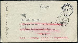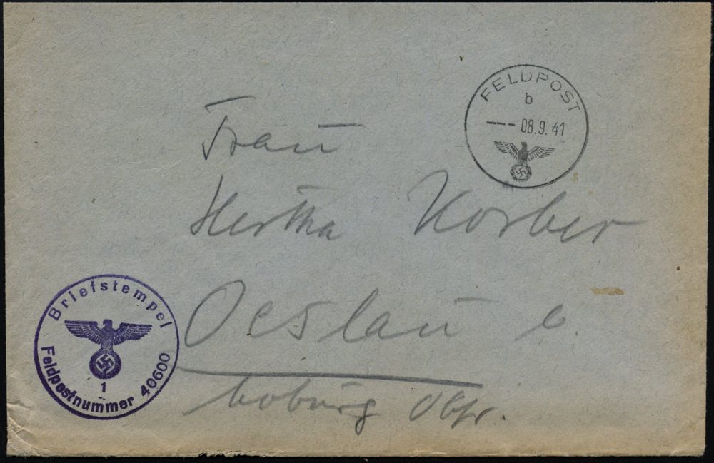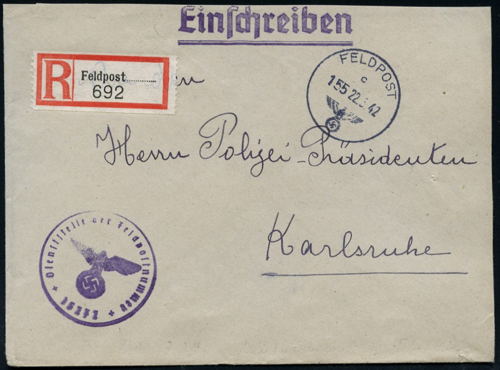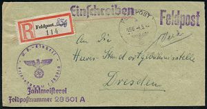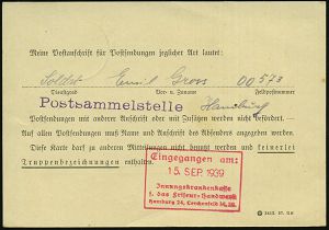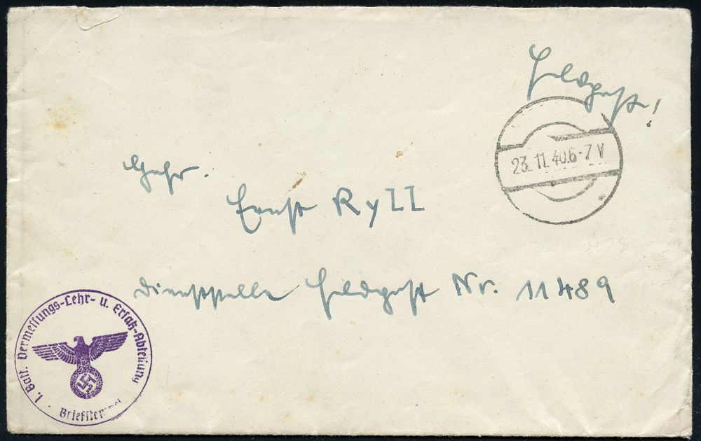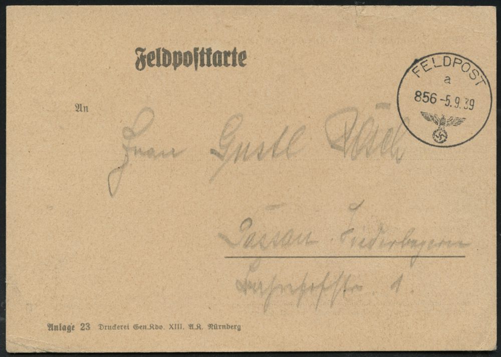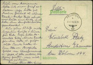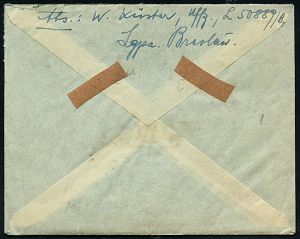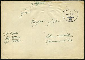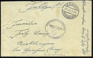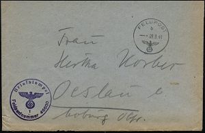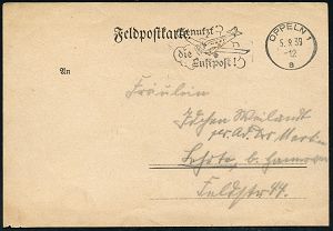 2141 | 65 € | II. WELTKRIEG (1939 - 1945) : BRESLAU 1/ z 1939 (26.8.) 2K-Steg auf Feldpost-Bf., wegen Feldpostsperre bis 2.9. frankiert, rs. hs. Abs. s e c h s s t e l l i g e Feldpost-Nr.: ".. Übungspostnummer 119 984, Postleitstelle Breslau 1" = Vorbereitung Polen-Feldzug! (Mi. 5 + 150.- EUR, 2009), vergl. Los Nr. 2156, sehr seltener Feldpost-Bf. n. Leipzig (Mi.513 (2), 516) | ![]() ![]() | |