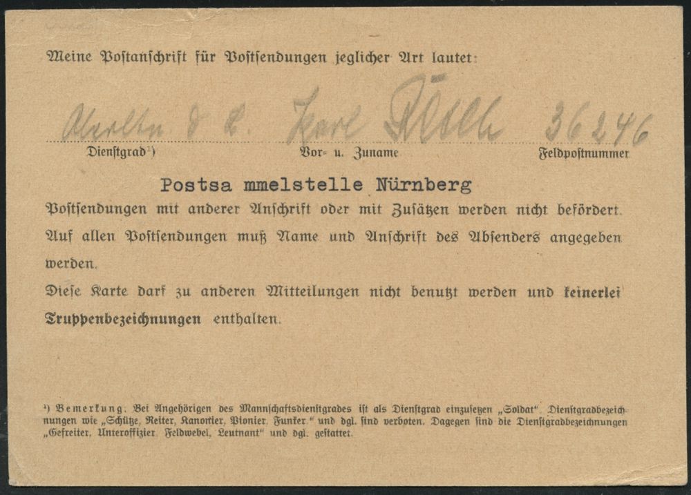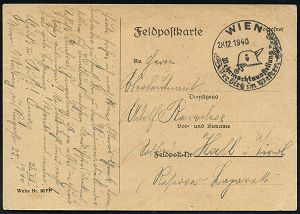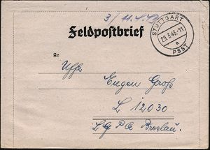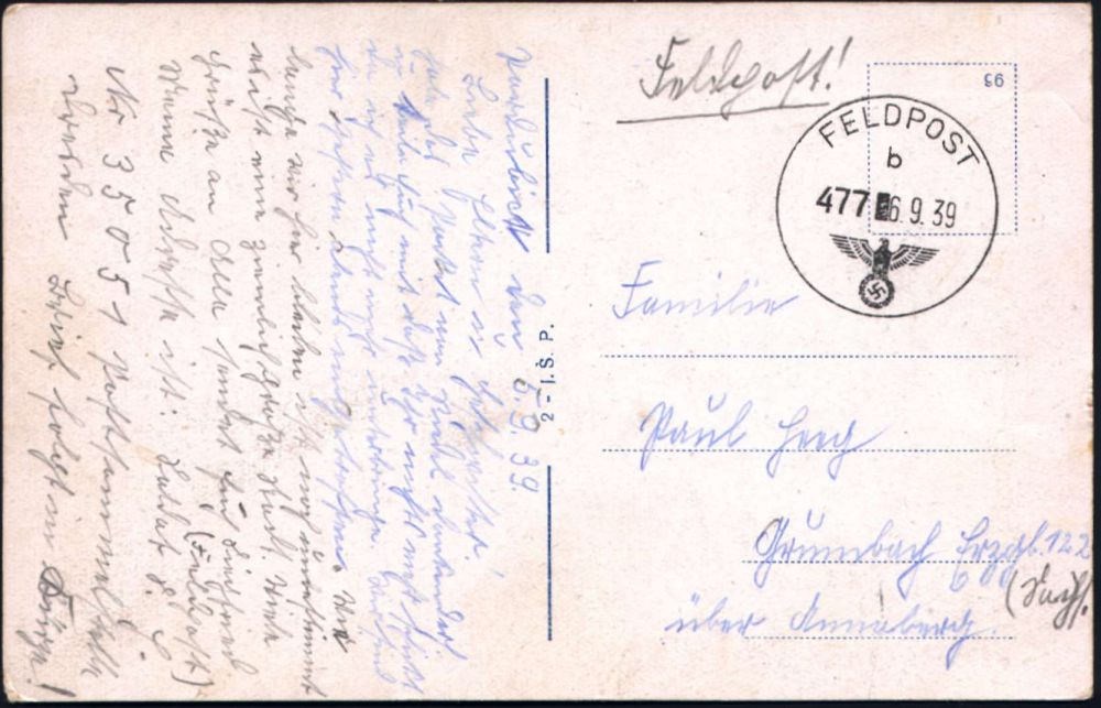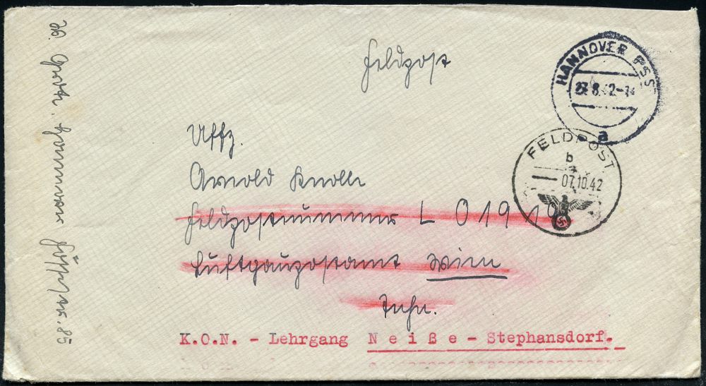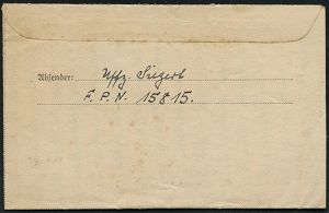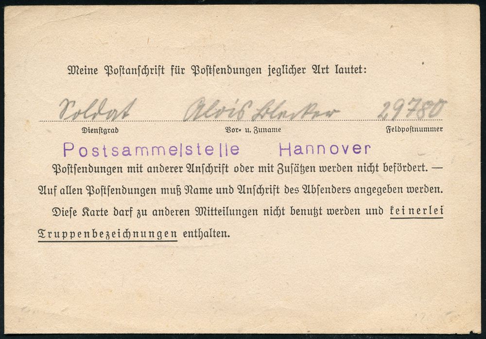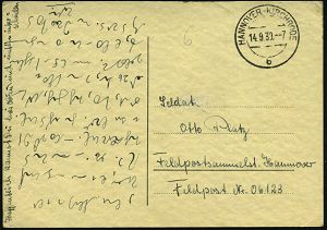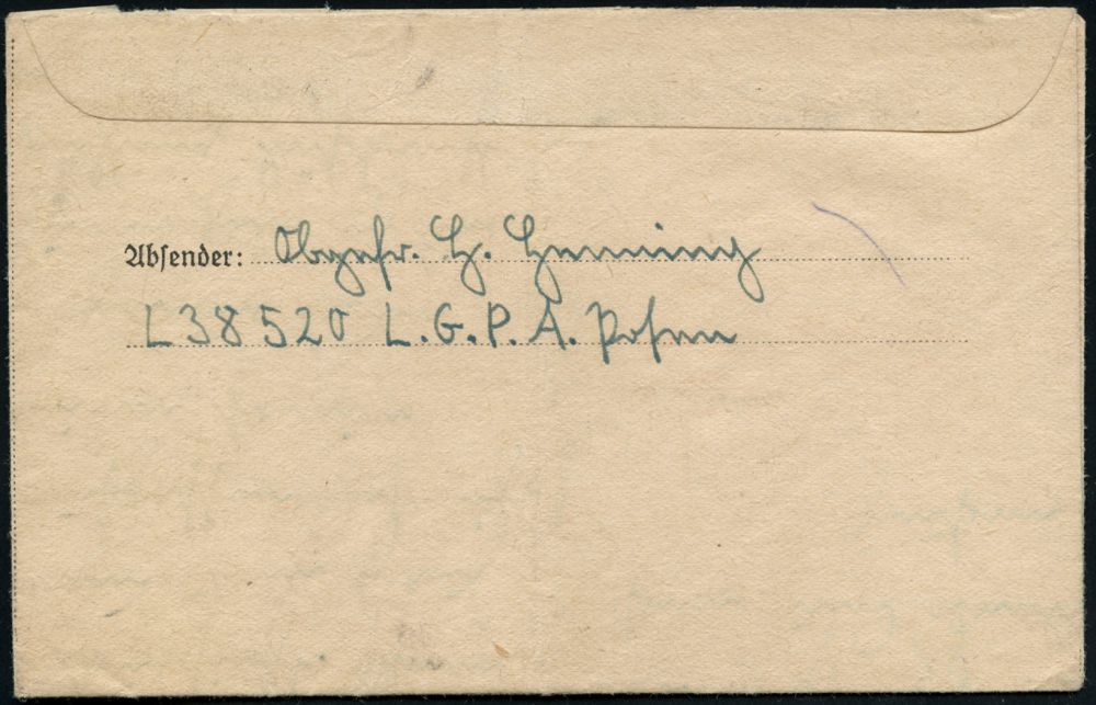 2141 | 65 € | II. WELTKRIEG (1939 - 1945) : BRESLAU 1/ z 1939 (26.8.) 2K-Steg auf Feldpost-Bf., wegen Feldpostsperre bis 2.9. frankiert, rs. hs. Abs. s e c h s s t e l l i g e Feldpost-Nr.: ".. Übungspostnummer 119 984, Postleitstelle Breslau 1" = Vorbereitung Polen-Feldzug! (Mi. 5 + 150.- EUR, 2009), vergl. Los Nr. 2156, sehr seltener Feldpost-Bf. n. Leipzig (Mi.513 (2), 516) | ![]() ![]() | |