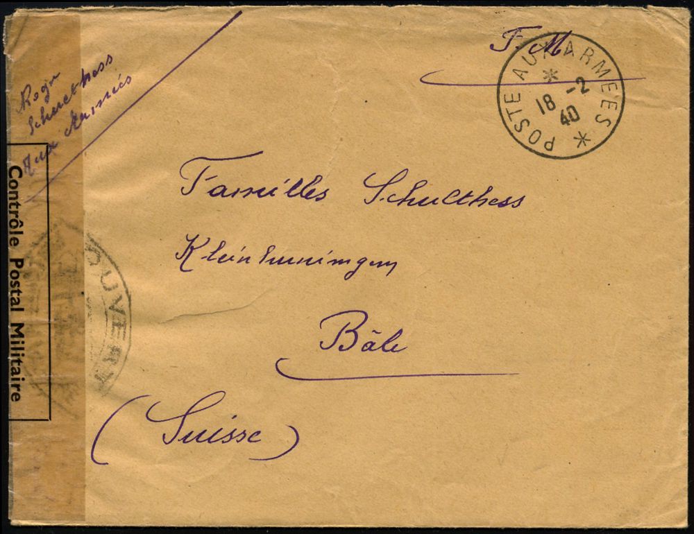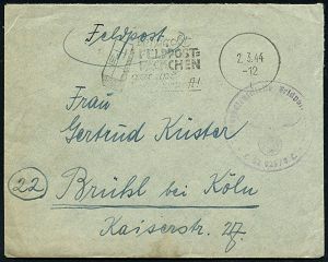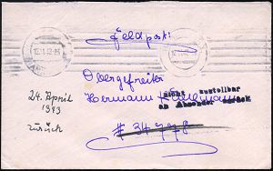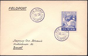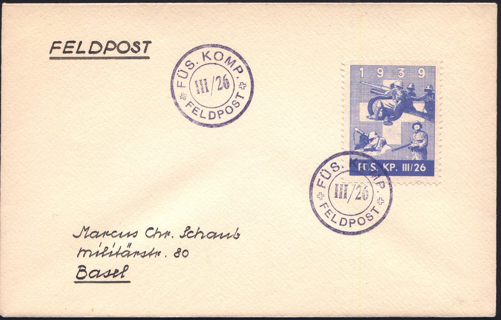 2571 | 15 € | II. WELTKRIEG (1939 - 1945) : SCHWEIZ 1939 seltene, blaue Soldatenmke. "FÜS. KP. III-26" , gez. = PaK etc. , viol. Feldpost-2K: FÜS. KOMP./III-26/ FELDPOST, klar gest. Feldpost-Bf. (Su.188.1) | ![]() | |
