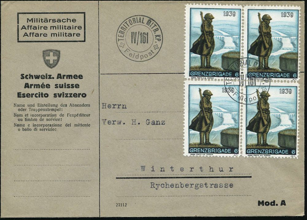 2575 | 20 € | II. WELTKRIEG (1939 - 1945) : SCHWEIZ 1939 (Nov.) Soldatenmarke "Grenzbrigade 6", gez. 4er-Block = Brückenwache / Viadukt u. Flußbrücke , viol. 2K: TERRITORIAL MITR. KP./IV-161/Feldpost, klar gest. Feldpost-Vordruck-Bf. (Su.21 MeF) | ![]() | |