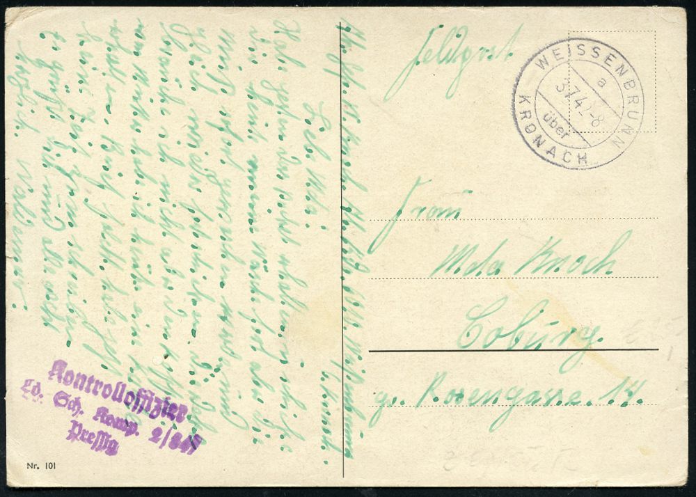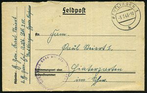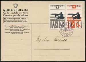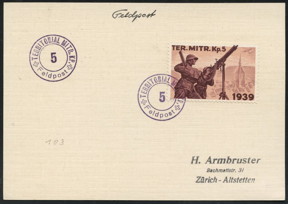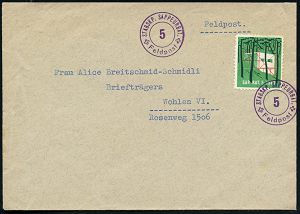 2573 | 14 € | II. WELTKRIEG (1939 - 1945) : SCHWEIZ 1939 Soldatenmke. "TER.MITR.Kp.5" , gez. viol./rötl./braun = sFla-MG , 2x viol. Feldpost-2K: TERRITORIAL MITR. KP./5/Feldpost, klar gest. Feldpost-Kt. (Su.49.1) | ![]() | |
