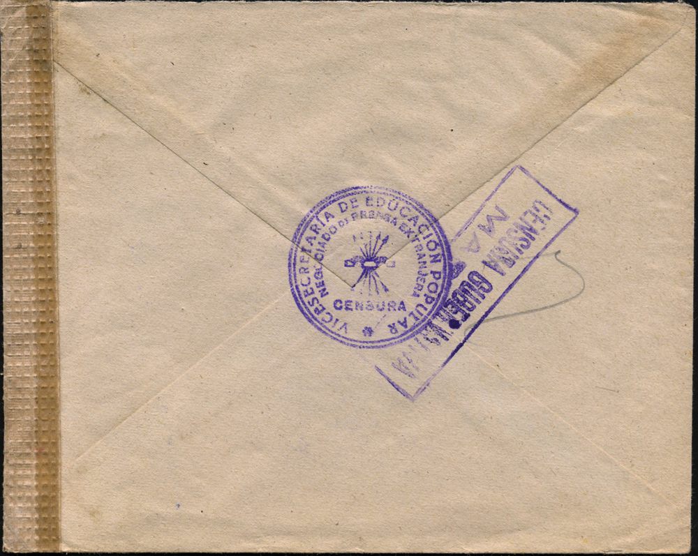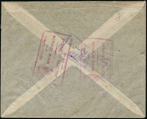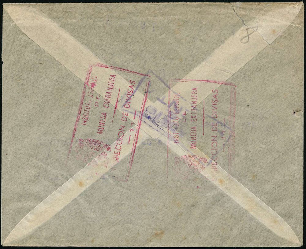 2587 | 18 € | II. WELTKRIEG (1939 - 1945) : SPANIEN 1943 (30.4.) AFS Francotyp: MADRID/1/BANCO HISPANO/AMERICANO/DEP.EXTRANJERO + Flp-6eck: MADRID + Leitvermerk: VIA STUTTGART, rs. viol. Zensur-Ra + rote Ra:..INSPECCION DE DEVISAS/-11- (Rand-/Klappenriß) Ausl.-Flp.-Devisen-Zensur-Bf. in dieSchweiz | ![]() ![]() | |