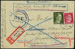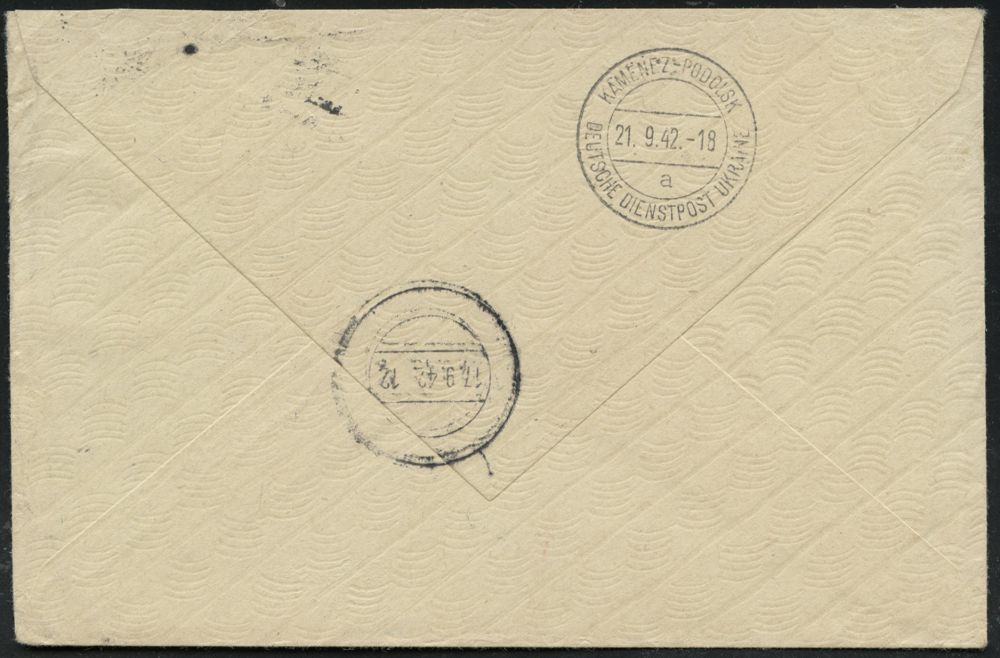 2527 | 25 € | II. WELTKRIEG (1939 - 1945) : DT.BES.UKRAINE 1942 (14.9.) 2K-Steg: BERLIN NO 55/q + RZ: Berlin 55/o + hs. "Deutsche Dienstpost Ukraine" ,rs. stummer 2K-AS = WINNITZA + vs. viol. Dienst-HdN: Zentral-Handelsges./ OST/ Winniza/ Reichsmonopolges., 2x nachgesandter, seltener R-Bf. n. KAMMEZ-PODOLSK (TS), n. Winnitza weitergeleitet! (Mi.788, 794) | ![]() ![]() | |