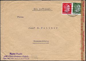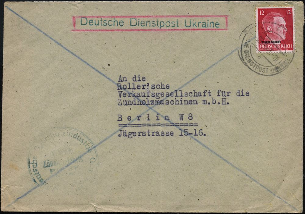 2529 | 16 € | II. WELTKRIEG (1939 - 1945) : DT.BES.UKRAINE 1943 (3.9.) 2K-Steg: PINSK/o/DDPU, EF 12 Pf. Hitler + grüner 1L: Deutsche Dienstpost Ukraine + HdN: Ostdeutsche Sperrholzindustrie GmbH/Züdholzfabrik/Pinsk.. (teils etw. schwach) Fernbf. n. Berlin (Mi.8 EF) | ![]() | |