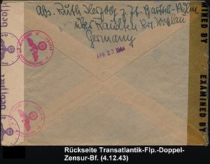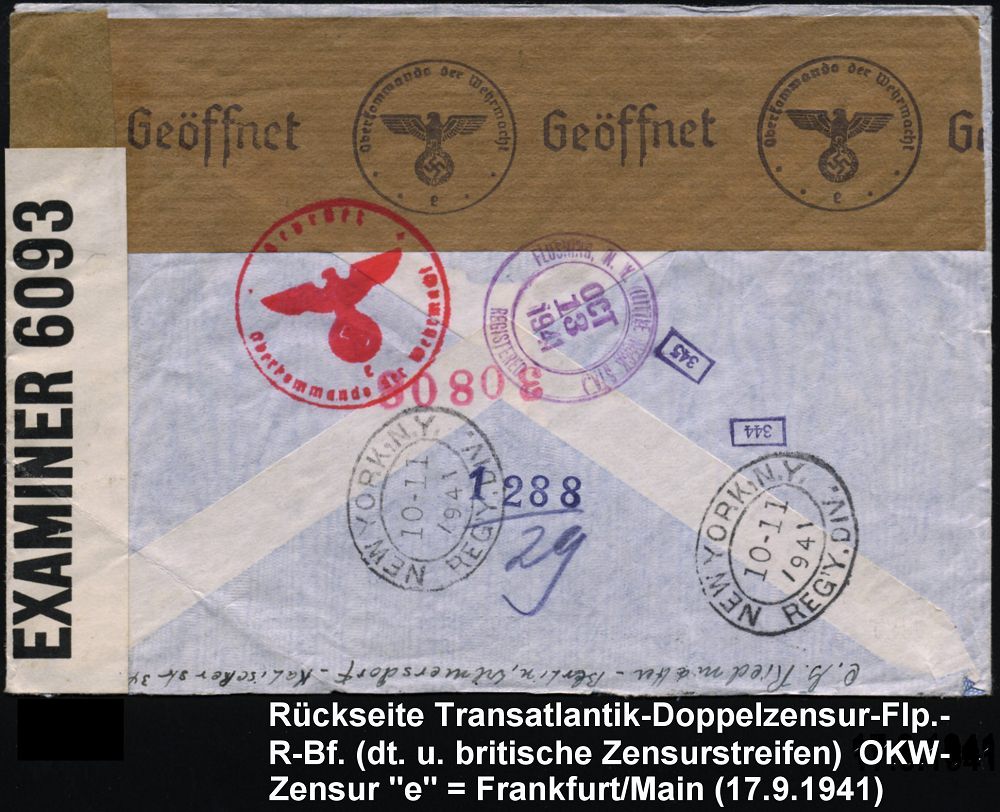 2104 | 23 € | II. WELTKRIEG (1939 - 1945) : BERLIN-CHARLOTTENBURG 7/ i 1941 (17.9.) 2K-Steg auf satzreiner 3-Farben-Frankatur Hindenbg. 4 Pf., 40 Pf. u. 50 Pf. (50 Pf. Schürfpunkt) + RZ: Berlin-/Charlottenburg 7/c + Doppel-Zensur: OKW-Streifen "e" + roter 1K (= Frankfurt/M., Rie.E-3 a, E-54) + brit. Zensur-Streifen PC.90 (3x AS: NEW YORK) kurz vor US-Kriegseintritt !, portorichtiger Transatlantik-Flp.-Zensur-R-Bf. via Lissabon (Mi.515, 524/25) | ![]() ![]() | |