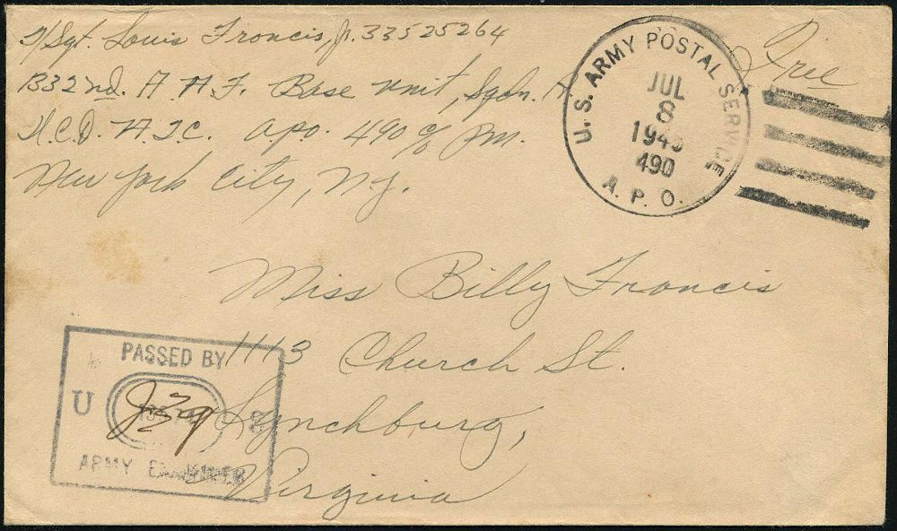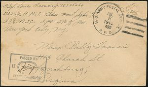 2617 | 15 € | II. WELTKRIEG (1939 - 1945) : U.S.A. 1945 (8.7.) 1K-Killer: U.S. ARMY POSTAL SERVICE/A.P.O./490 = Fp.-Amt New York , vorher Indien ! (6.11.45 geschlossen) + schw. Zensur-Ra.: PASSEY BY/U 13574 S/ARMY EXAMINER (Wo.1) später Feldpost-Bf. (n. Lynchburg, Virginia) | ![]() | |