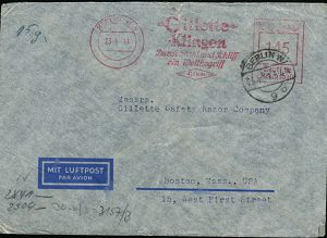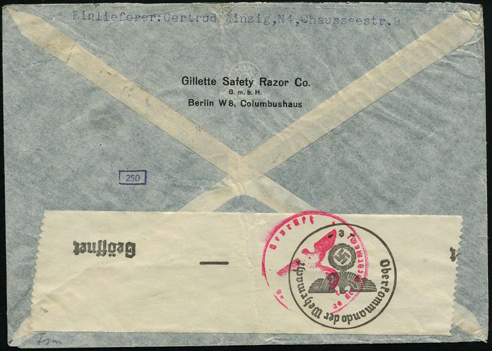 2100 | 20 € | II. WELTKRIEG (1939 - 1945) : BERLIN W 9/ Gilette/ Klingen.. 1941 (23.4.) AFS Francotyp "Reichsadler" 145 Pf. (Firmen-Logo) = US.-Firma für Rasierklingen + 1K-Brücke BERLIN W/9/o, rs. OKW-Zensurstreifen "e" + roter 1K "Geprüft" (= Frankfurt/M., Rie.E-3 a, E-52) Übersee-Flp.-Zensur-Bf (schwache Mittelfalte) vor Kriegseintritt der USA n. Boston an Mutter-Firma (Dü.E-5CEo) | ![]() ![]() | |