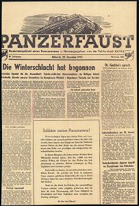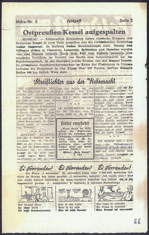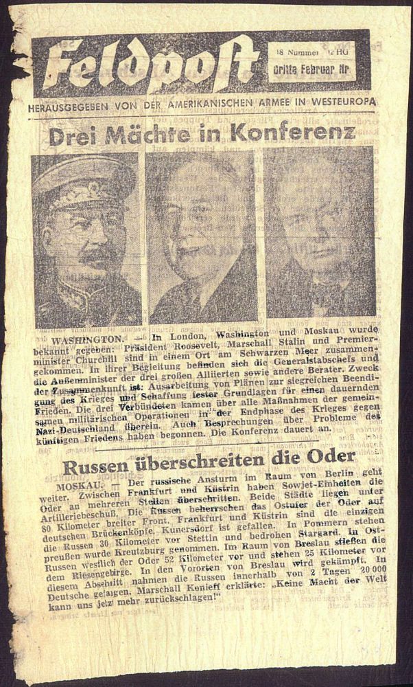 2615 | 25 € | II. WELTKRIEG (1939 - 1945) : U.S.A. 1945 (Feb.) amerikan. Propaganda-Flugblatt "Feldpost" 3. Nummer: Drei Mächte Konferenz (Stalin, Roosevelt, Churchill): "Russen überschreiten die Oder" und: "Berlin stirbt" (2 Seiten) übliche Knitter u. Randmäng., selten! | ![]() ![]() | |