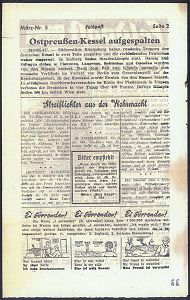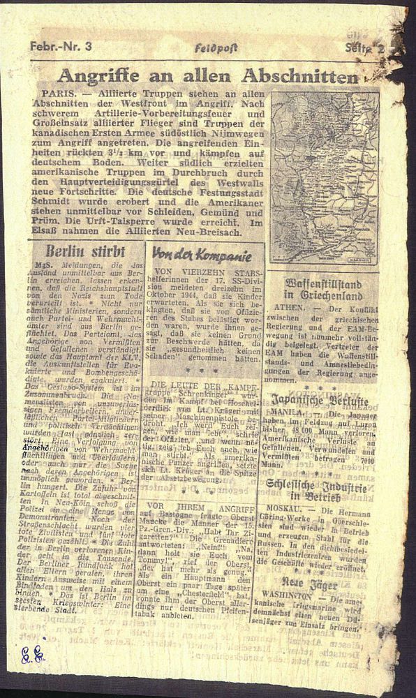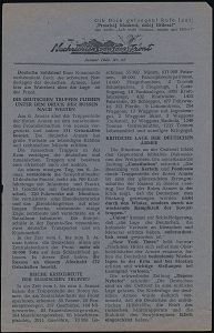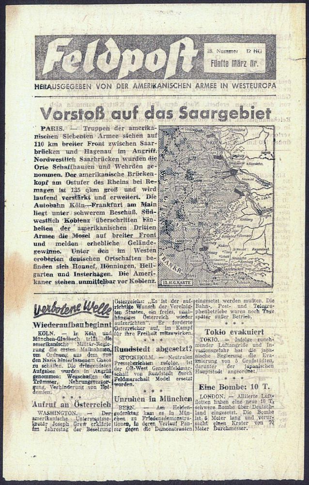 2616 | 20 € | II. WELTKRIEG (1939 - 1945) : U.S.A. 1945 (März) deutsch-sprachiges US-Flugblatt "Feldpost" 5. Nummer: Vorstoß auf das Saargebiet (Landkarte) Berichte über Ostpreußen-Kessel, kl. Englischkurs "Ei sörrender!" (Format 13,2 x 20,8 cm, kl. Randmäng., Fleck) Bedarfs-Erhaltung, später Beleg! | ![]() ![]() | |