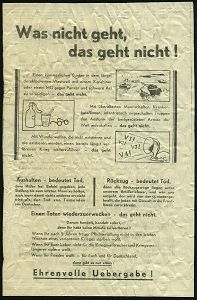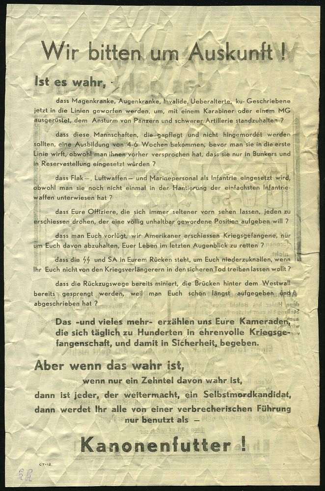 2614 | 25 € | II. WELTKRIEG (1939 - 1945) : U.S.A. 1944 deutsch-sprachiges Flugblatt: Was nicht geht, das geht nicht!.. Einen Toten wiederzuerwecken - das geht nicht , 3 Zeichnungen: Panzer, Medizin, Radiolautsprecher m. Ankündigung von V-Waffen: V 1! V 2!.. (Form: CT-12, Format 23 x 20 cm) übliche Knitter | ![]() ![]() | |