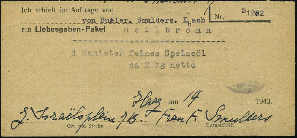 2560 | 25 € | II. WELTKRIEG (1939 - 1945) : NIEDERLANDE 1943 (18.11.) 2K-Steg: s´GRAVENHAGE NASSAUPLEIN auf 2x 2 1/2 C. Freimarke + viol. OKW-Durchlauf-Zensur-1K: "A. c." (= Köln, Rie.C-31) auf Liebesgabenkarte (für Speiseöl), Ausl.-Zensur-Kt. n. Hamburg (Mi.175 MeF) | ![]() ![]() | |