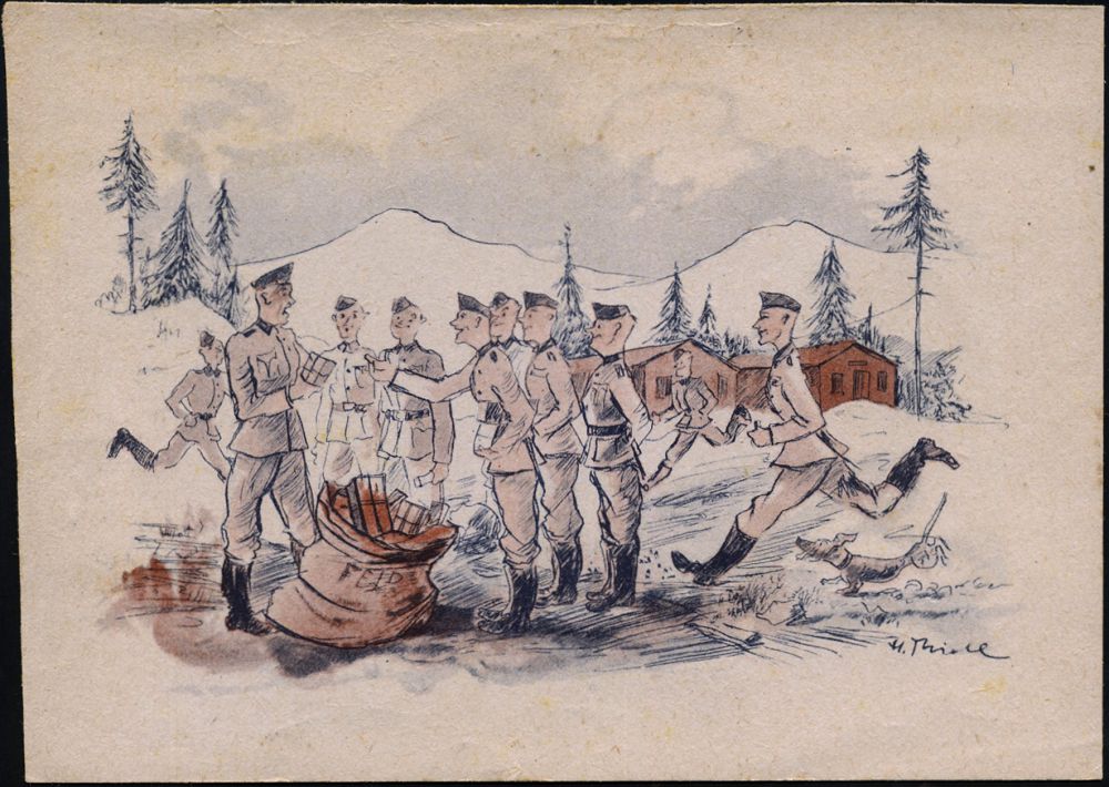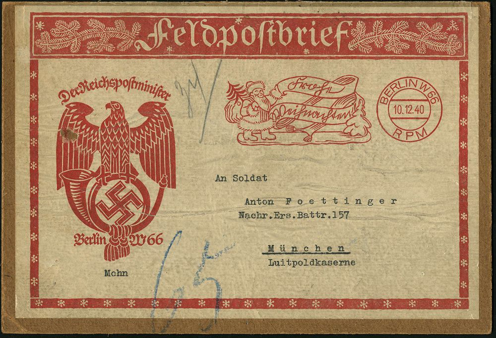 2099 | 250 € | II. WELTKRIEG (1939 - 1945) : BERLIN SW 66/ RPM/ Frohe/ Weihnachten! 1940 (10.12.) amtl.. Buchdruck-FaWSt. teils Sütterlin = Weihnachtsmann im Pelzmantel in Winterlandschaft , kompl. Feldpost-Päckchenaufkleber "Feldpostbrief, Der Reichspostminister" (kl. Schürfstelle unbedeu-tend) an Wehrmacht-Soldaten, sehr selten!, fehlt in fast allen Sammlungen! (Bochmann von 1940 unbekannt!) | ![]() | |