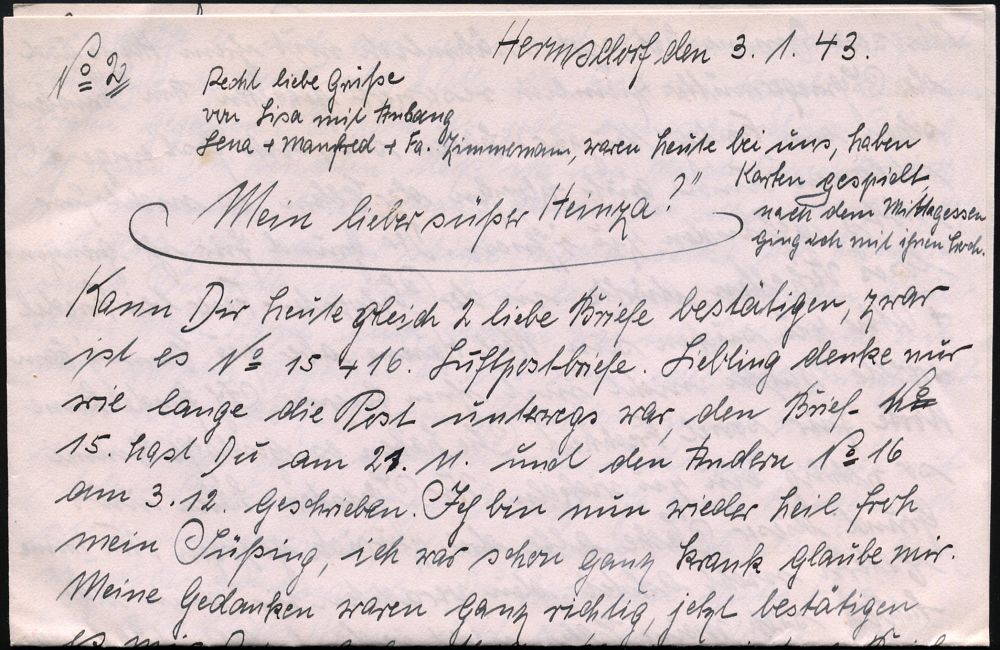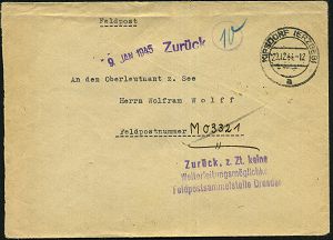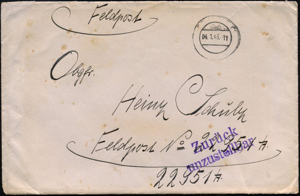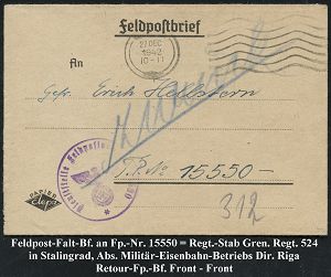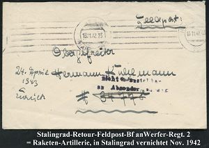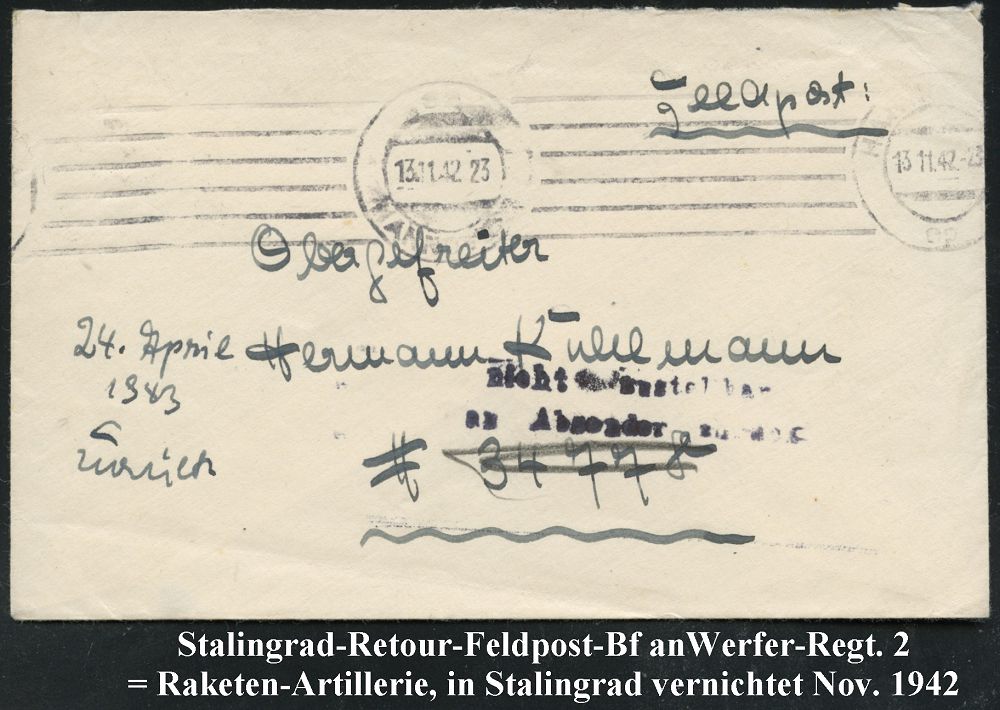 2122 | 30 € | II. WELTKRIEG (1939 - 1945) : Berlin-Hermsdorf 1943 (4.1.) stummer 2K = Tarnstempel Berlin + viol. 2L: Zurück/ unzustellbar, Feldpost-Retour-Bf. + Inhalt (minim. stockig) an Fp.-Nr. 22 951 = Art. Rgt. 3 = S t a l i n g r a d = Kapitulation der 6. Armee!, interess. Text über die Laufzeit von Briefen (Abs. Berlin-Hermsdorf) | ![]() ![]() | |
