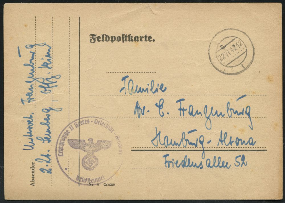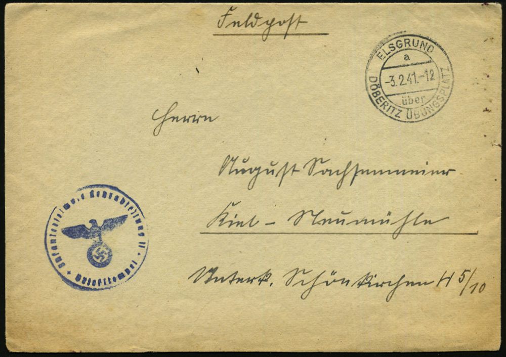 2157 | 18 € | II. WELTKRIEG (1939 - 1945) : ELSGRUND/ a/ über/ DÖBERITZ ÜBUNGSPLATZ 1941 (3.2.) 2K-Steg = Hauspostamt Truppenübungsplatz, PSt. I-Typ (Mi.9) + bl. 1K-HdN: Infanterieschule Stabsabteilung II, Feldpost-Bf. (unten schwache Bräunung) + Inhalt: Briefbogen + Hektogaphie "Wehrgesetz für Mädchen", 3 Belege kompl., seltener Inhalt! | ![]() ![]() | |