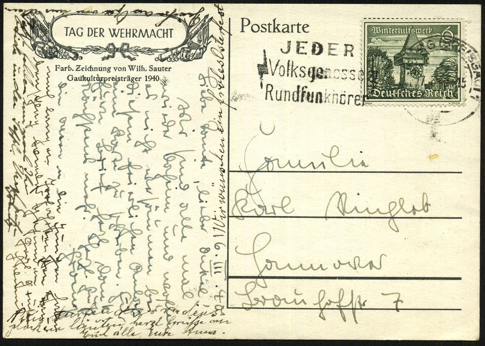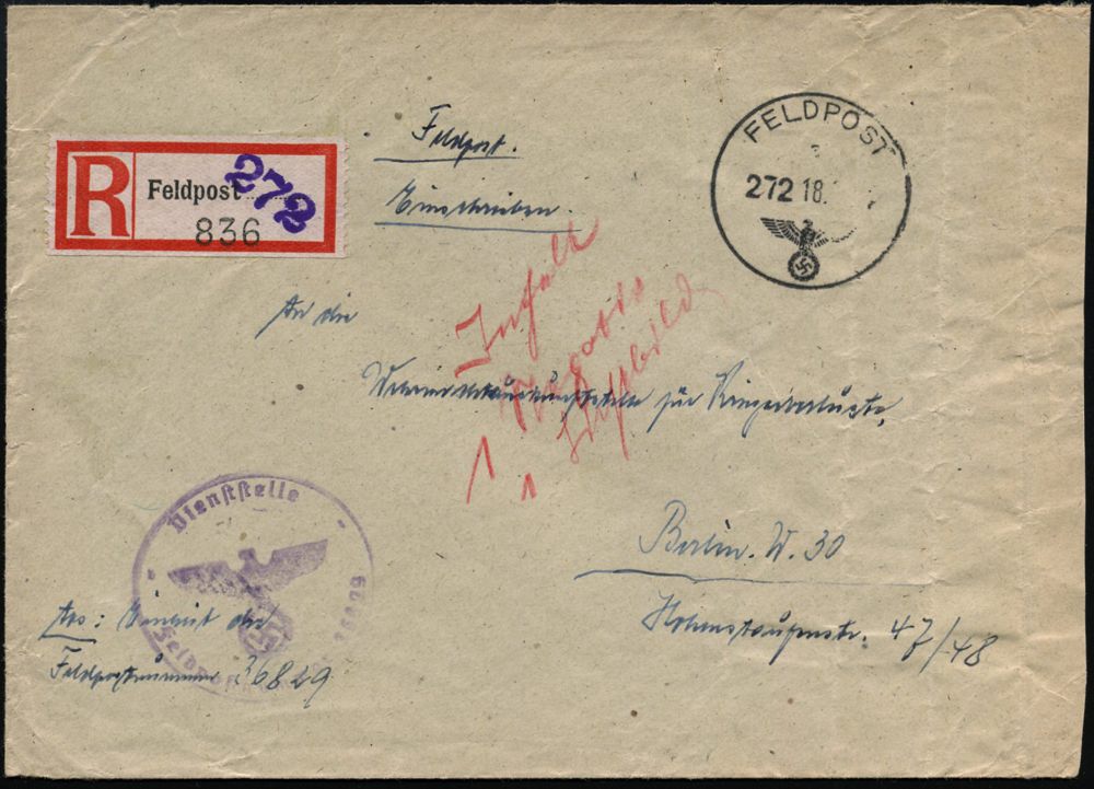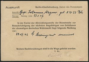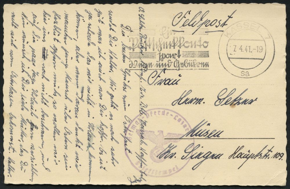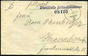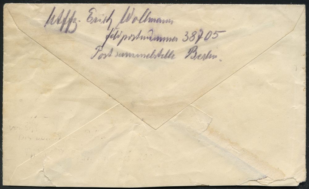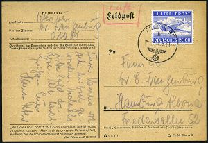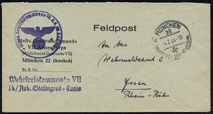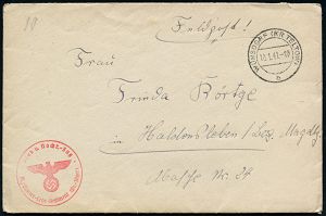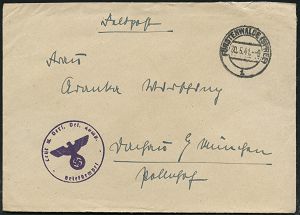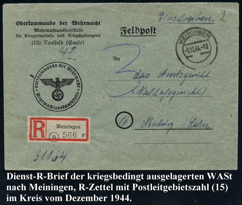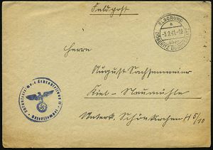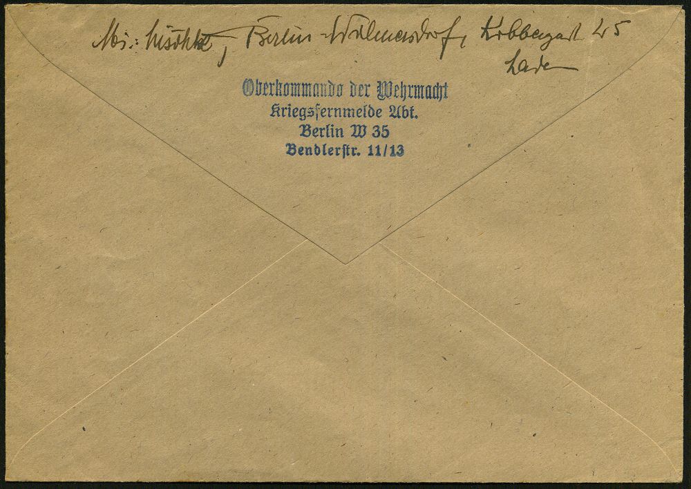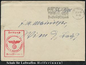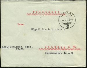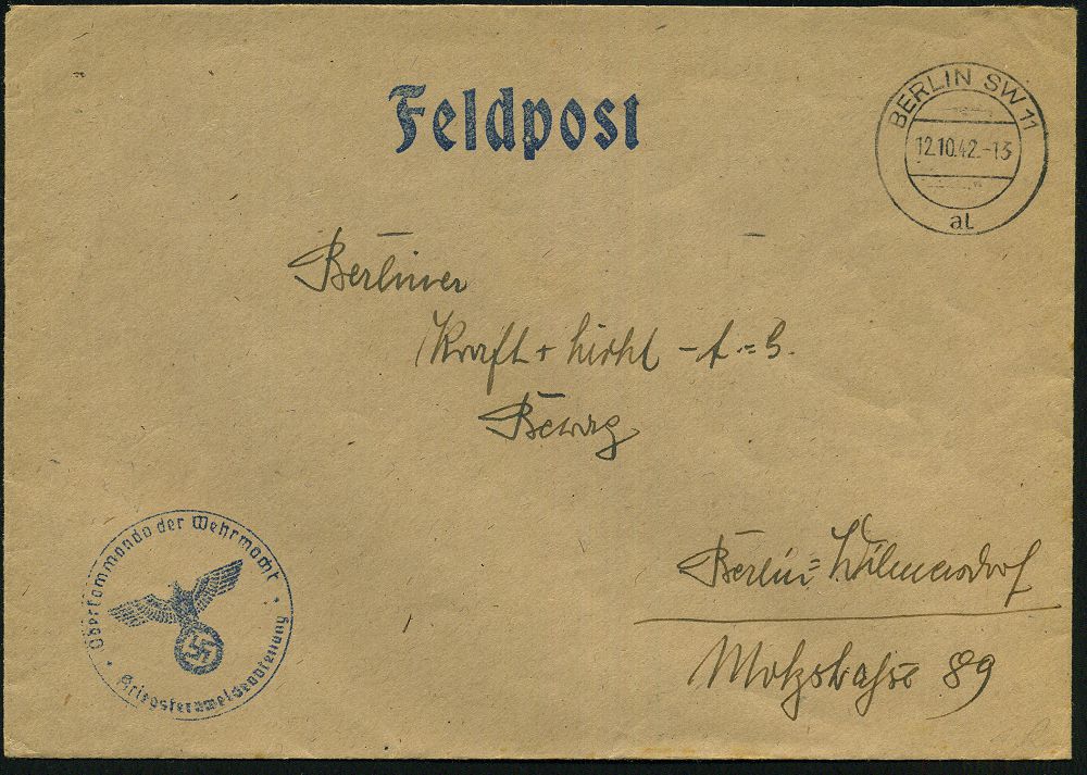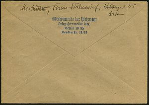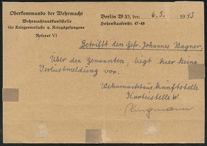 2105 | 18 € | II. WELTKRIEG (1939 - 1945) : Berlin W 30 1941 (24.10.) Dienst-Bf.: Oberkommando der Wehrmacht, Wehrmachtsauskunftsstelle für Kriegerverluste u. Kriegsgefangene (WASt) MWSt.: BERLIN SW 11/al/Vergiß nicht Straße.. (Bf. kl. Riß) Dienst-Feldpost-Bf. n. Neukirch/Lausitz | ![]() | |