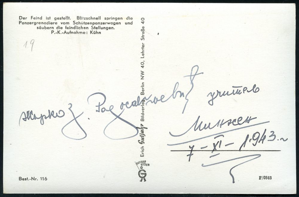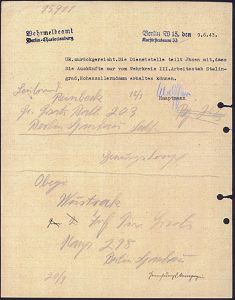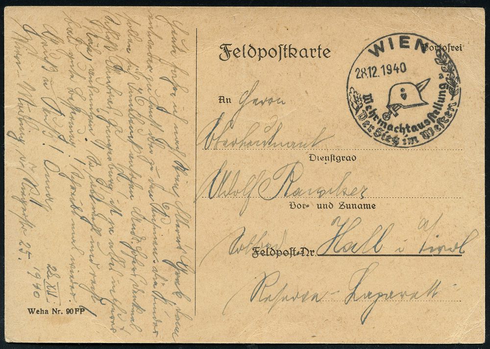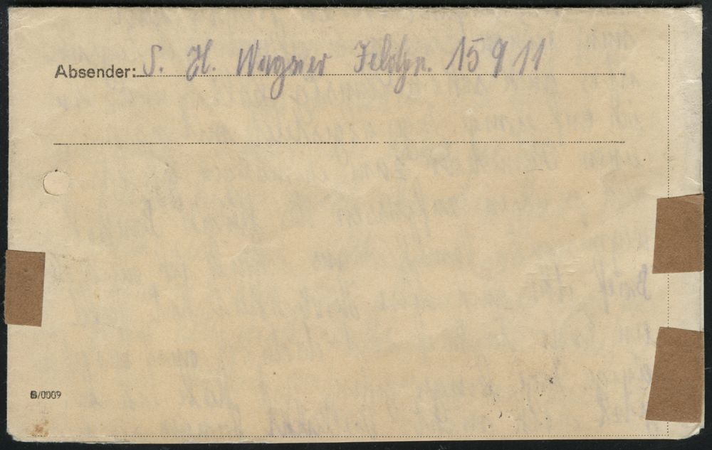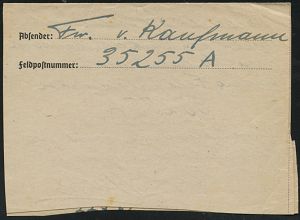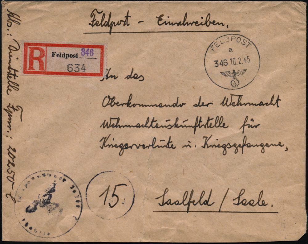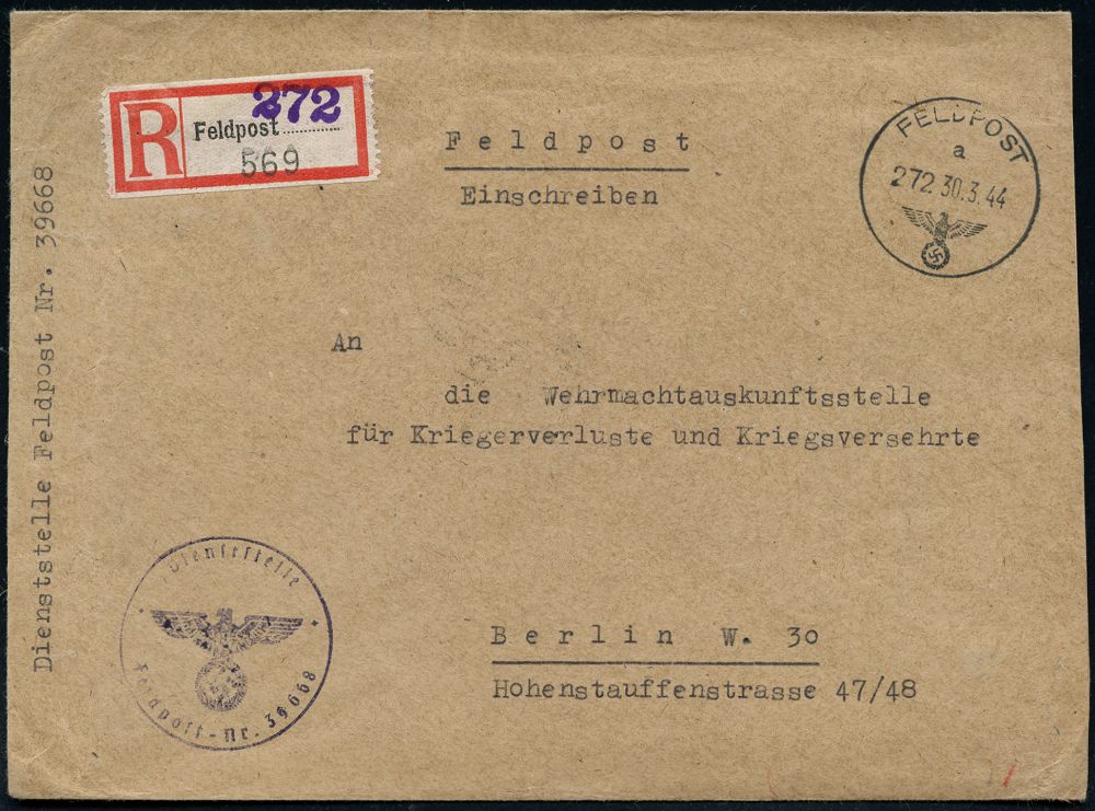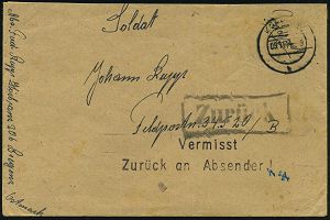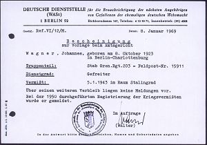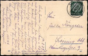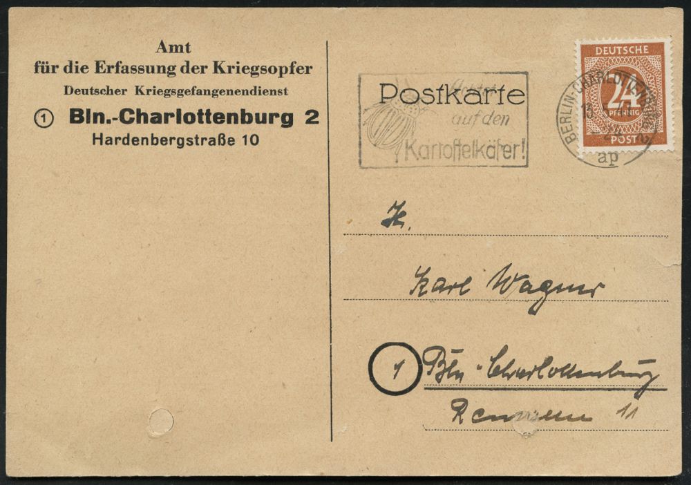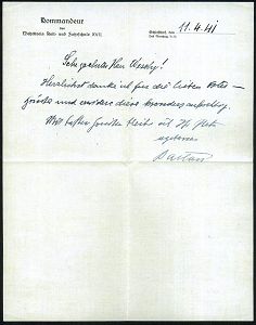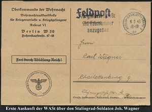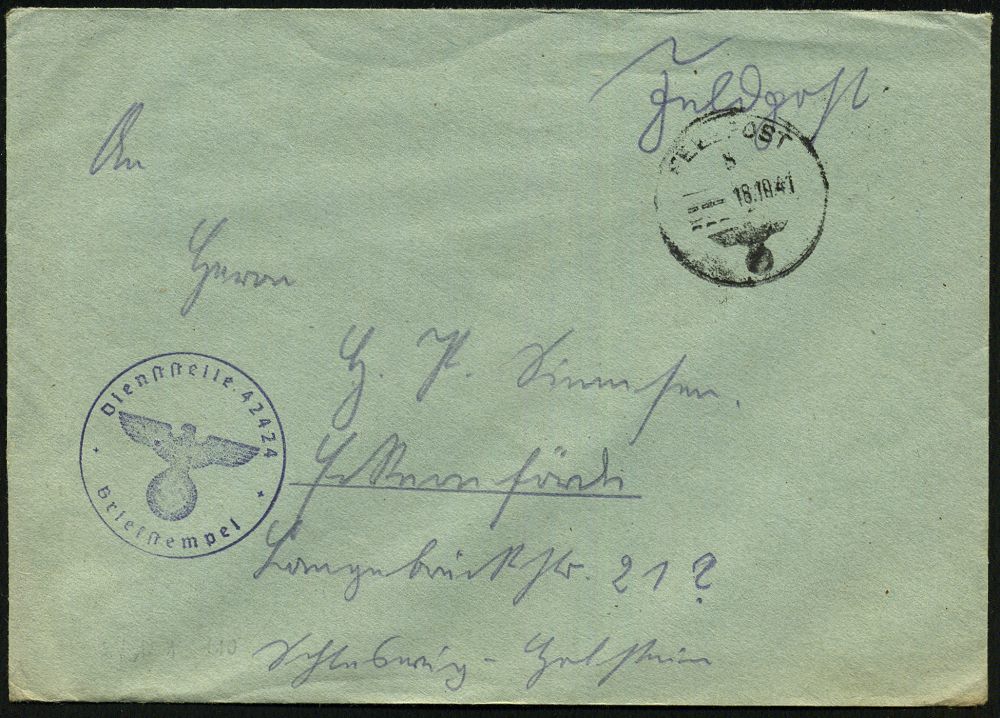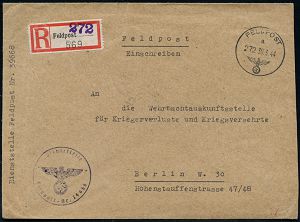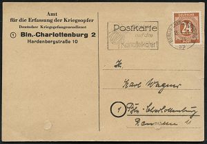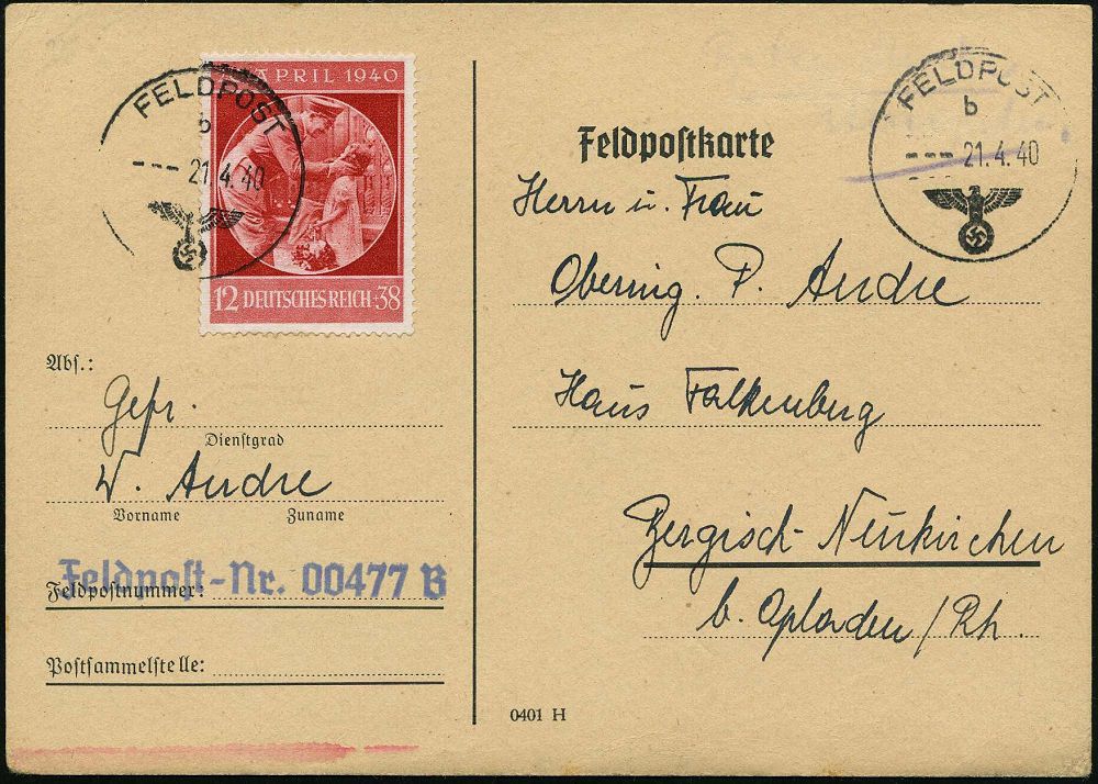 2105 | 18 € | II. WELTKRIEG (1939 - 1945) : Berlin W 30 1941 (24.10.) Dienst-Bf.: Oberkommando der Wehrmacht, Wehrmachtsauskunftsstelle für Kriegerverluste u. Kriegsgefangene (WASt) MWSt.: BERLIN SW 11/al/Vergiß nicht Straße.. (Bf. kl. Riß) Dienst-Feldpost-Bf. n. Neukirch/Lausitz | ![]() | |
