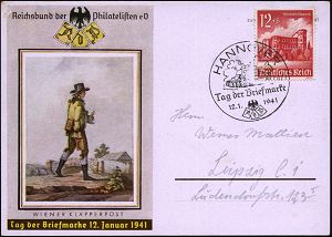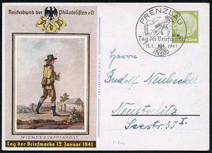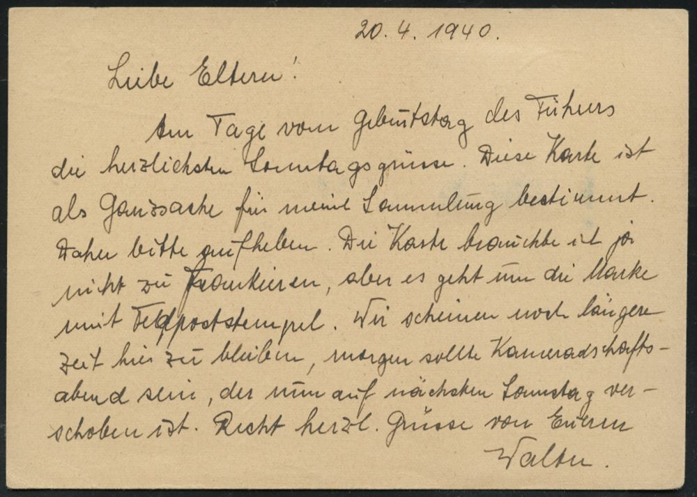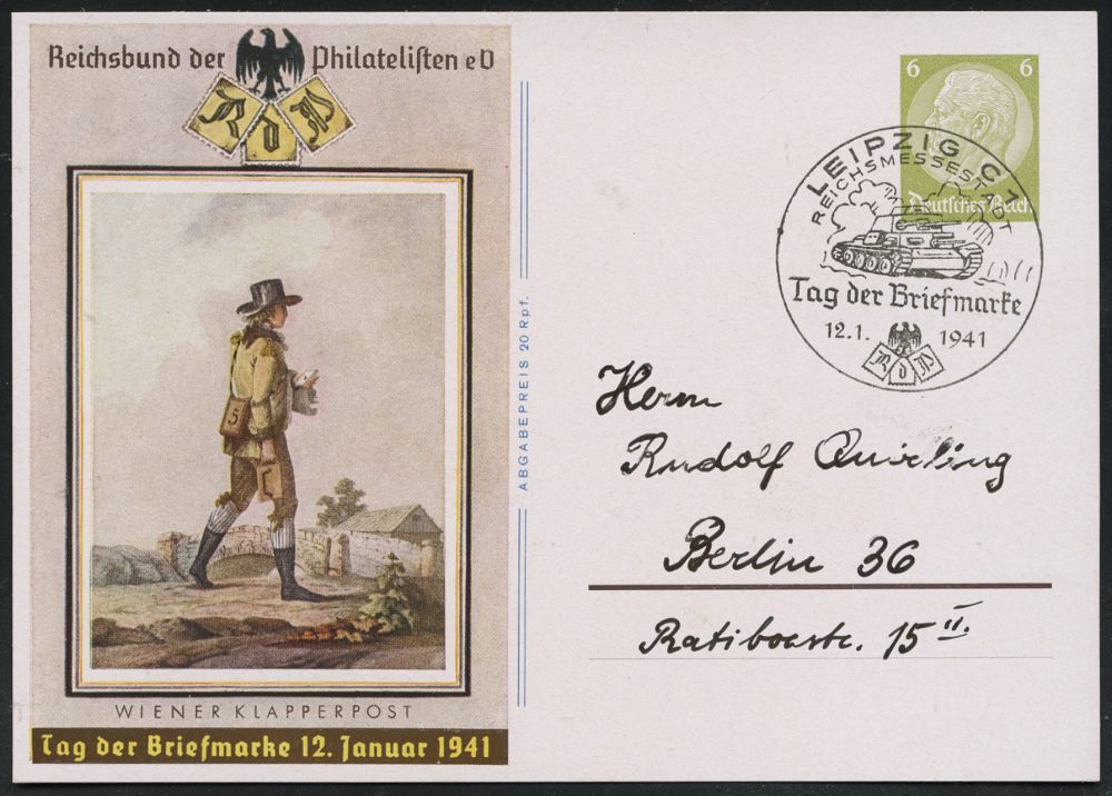 2110 | 25 € | II. WELTKRIEG (1939 - 1945) : BERLIN/ a/ Großdeutscher Reichstag 1942 (26.4.) SSt = Hauspostamt Reichstag auf seltener PP 6 Pf. Posthorn, viol. (Mi.PP 150/A 1, + 50.- EUR) klar gest. Inl.-Kt. = letzter Reichstag der NS-Zeit in der Kroll-Oper, endgültige u. absolute Gleichschaltung des Beamten-Apparates auf Führerbefehle + Info-Kopie (Bo.315 a) | ![]() ![]() | |