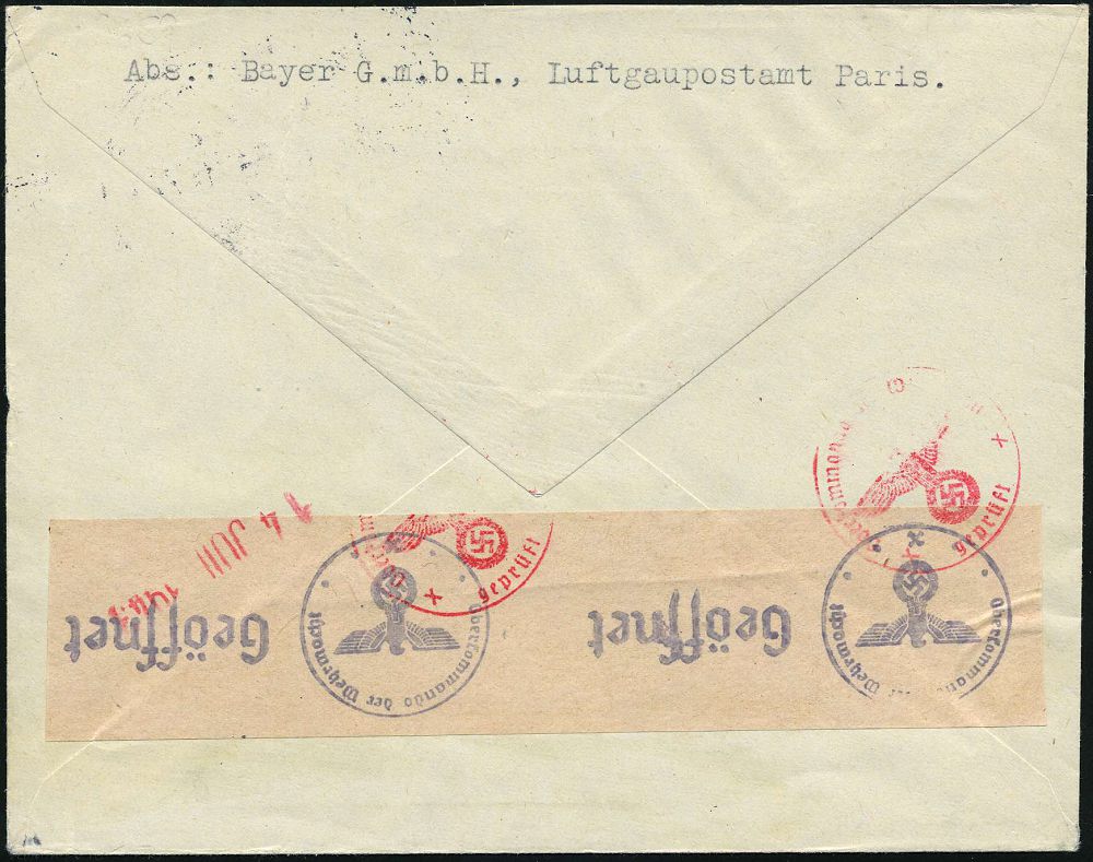 2544 | 12 € | II. WELTKRIEG (1939 - 1945) : FRANKREICH 1941 (1.7.) 2,50 Fr. Ceres, blau , EF + MaWellenSt.: PARIS/GARE SAINT LAZARE + OKW-Zensurstreifen + roter Band-Ma.Stpl. "c" = Köln (Rie.C-20, C-54) Ausl.-Transit-Zensur-Bf. n. Den Haag (Mi.404) | ![]() ![]() | |