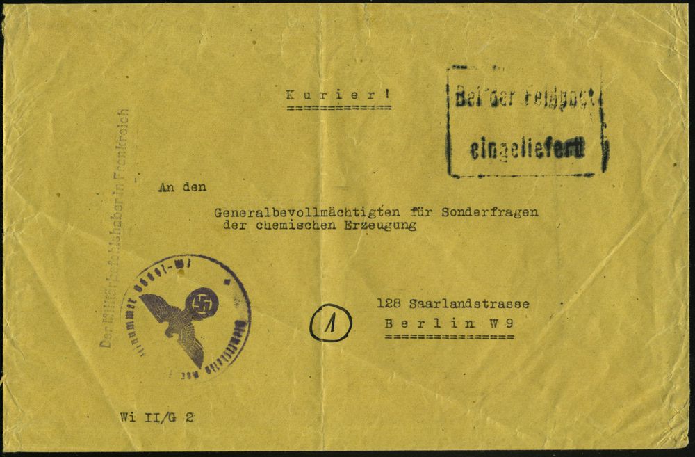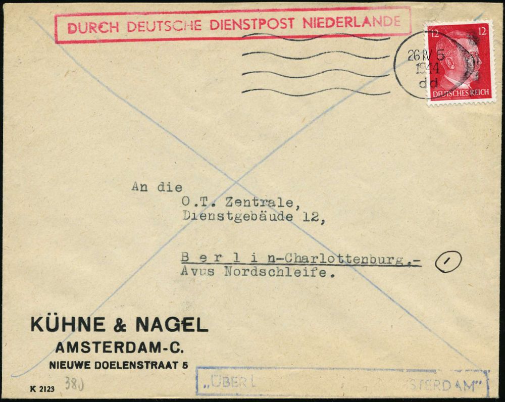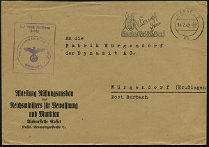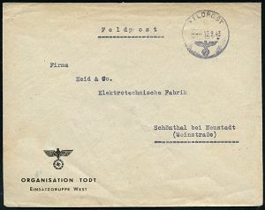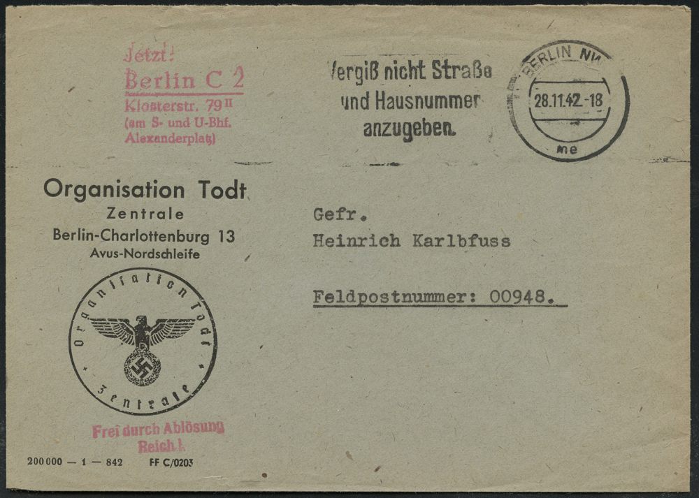 2120 | 30 € | II. WELTKRIEG (1939 - 1945) : BERLIN NW 7/ me/ Vergiß nicht Straße/ u.Hausnummer.. 1942 (28.11.) Serien-MaWSt auf Dienst-Bf.: Organisation Todt, Zentrale.. + 2L: Frei durch Ablösung/ Reich ! + neue Adr.-HdN, Dienst-Feldpost-Bf. an Fp.-Nr. 00948 , Organisation Todt, Leiter Fritz Todt (1891-1942) danach Albert Speer, paramilit. Bau-Organisation, Bau des West- u. Atlantikwalls, Hitlers Wolfsschanze, U-Boot-Bunker u.v.a., 1944 1,36 Mio. Arbeitskräfte inkl. Kgf.-, Zwangsarbeiter u. KZ-Häftlinge (von Alliierten Okt. 1945 aufgelöst) | ![]() | |