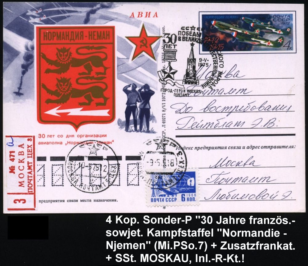 2598 | 14 € | II. WELTKRIEG (1939 - 1945) : UdSSR 1975 (9.5.) 4 Kop. Sonder-P: 30. Jahrestag französ.-sowjet. Jagd-Geschwader (Jagdflugzeuge) + Zusatzfrank., SSt: MOSKAU/30.JAHRESTAG DES SIEGES + roter RZ, Inl.-R-Karte! (Mi.LP 35) | ![]() | |