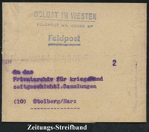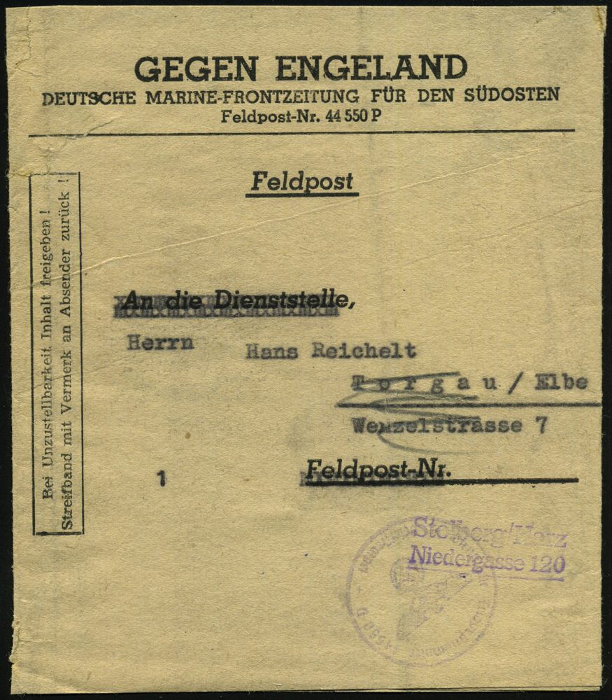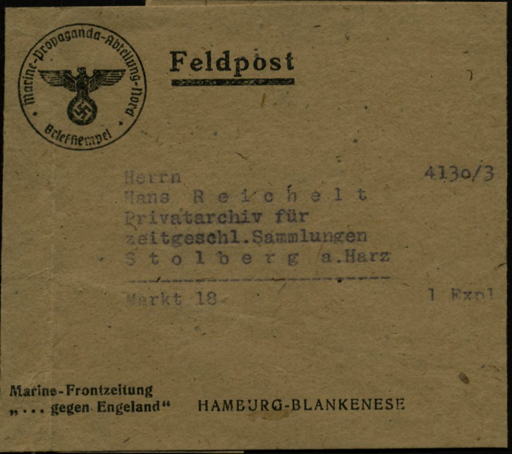 2174 | 25 € | II. WELTKRIEG (1939 - 1945) : Hamburg-Blankenese 1941 (ca.) Feldpost-Zeitungs-Streifband: Marine-Propaganda-Abt. Nord, Marine-Frontzeitung "..gegen Engelland" n. Stolberg | ![]() | |
